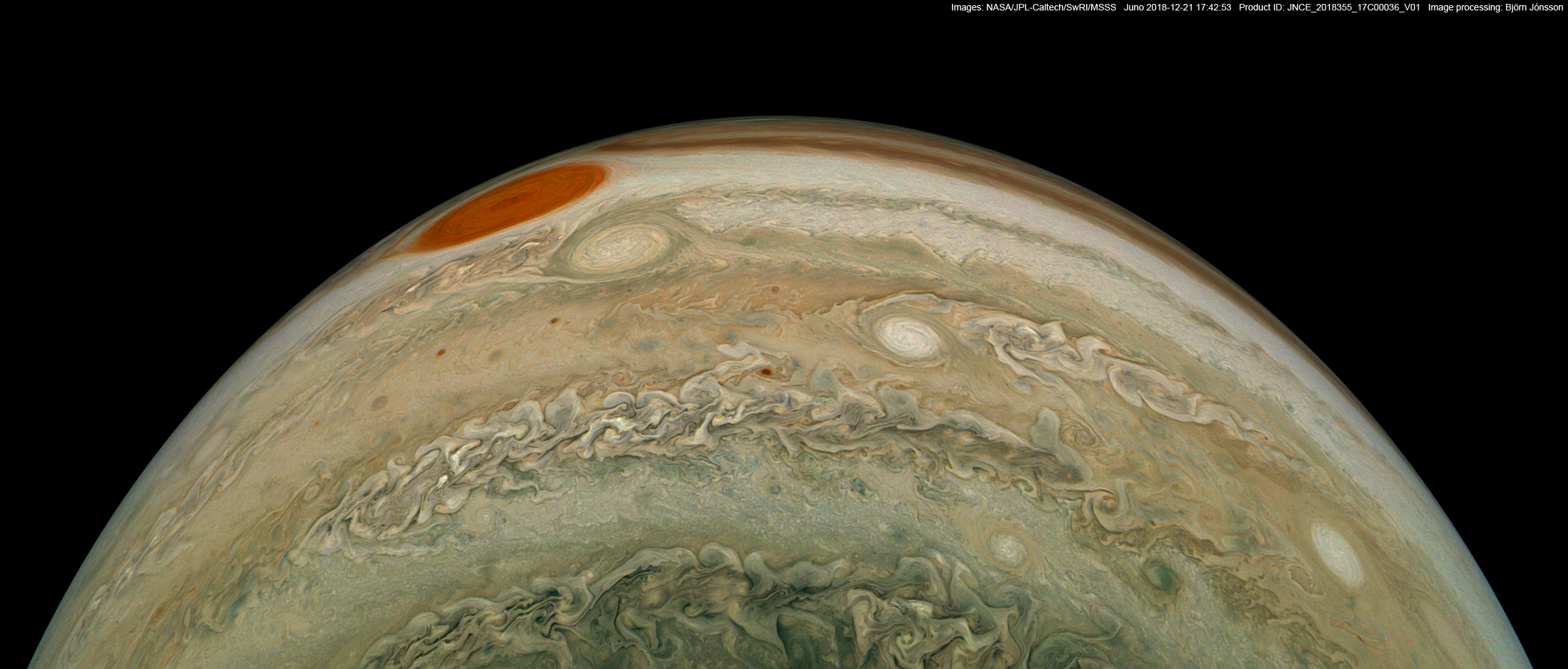 An image processed from the PJ17_36 raw image framelets. The contrast/color has been exaggerated and small scale features sharpened. The Great Red Spot is prominent near the limb with Oval BA visible below it. Recently the color of Oval BA has been fading.