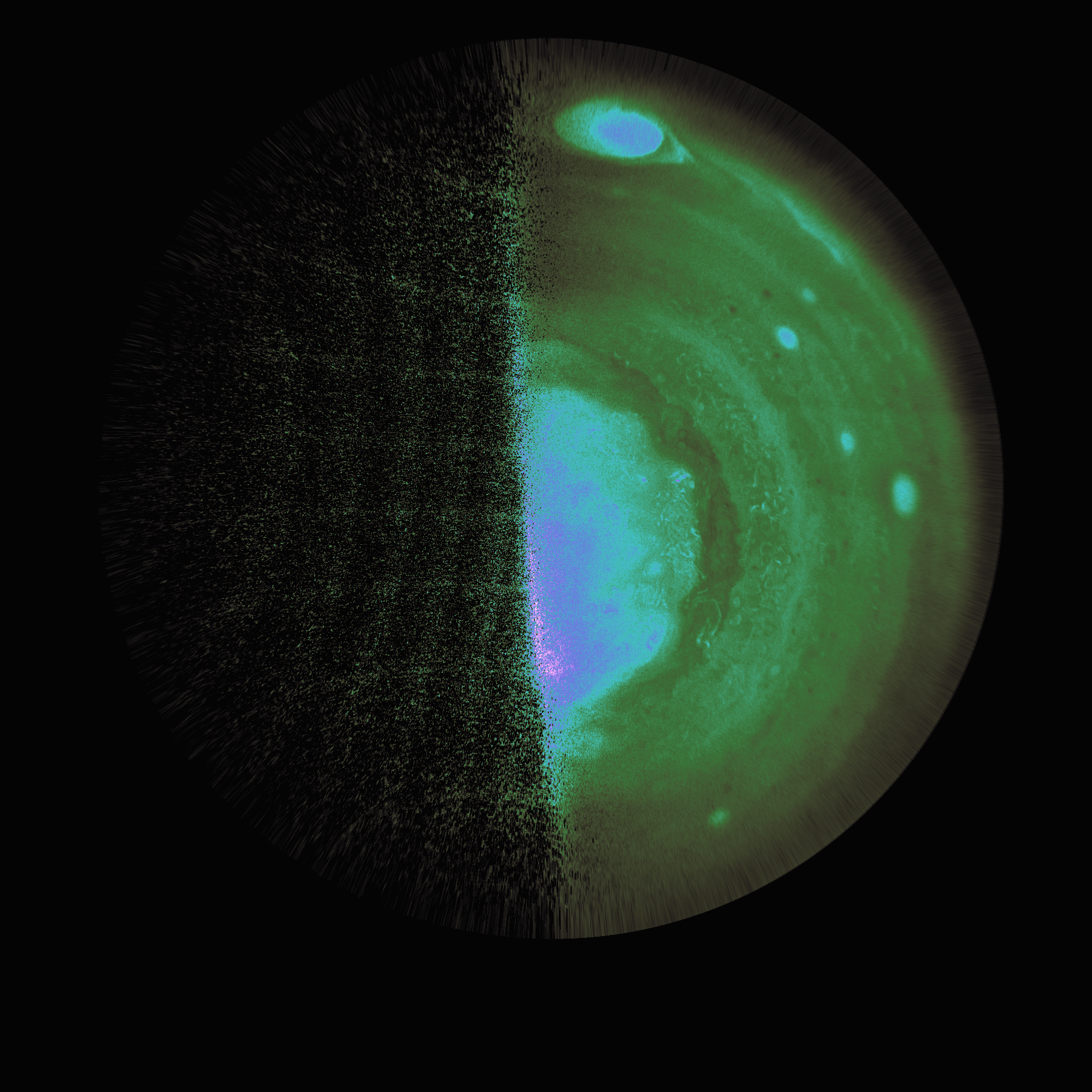South polar equidistant azimuthal planetocentric methane band map in false color, stacked from four Perijove 19 methane band images. Grey scales have been encoded in hue, value, and saturation.