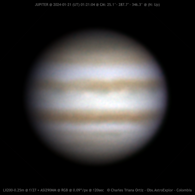 Jupiter 2024/01/21 (UT) 01:21:04 CM= 25.1°/287.7°/346.3° SCT LX200UHTC 0.25m + Barlow 2x + ASI290MM + RGB Filters @ 0.09”/pixel (f/27) RGB: 3981/3985/3563 frames @ 99/99/89 fps @ 120sec S: 4/10 – T: 4/5 – Alt: 58° Observer Name: Charles Triana Site: Colombia (5.6°N - 73.6°W - 2124m)