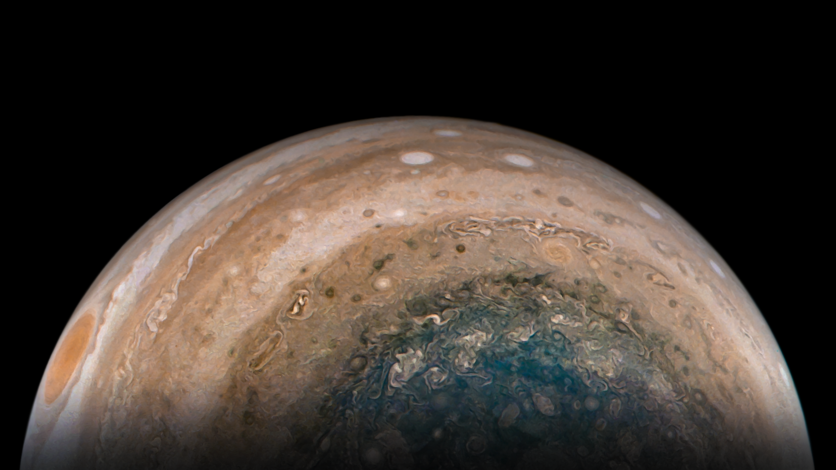 Processed using the JunoCam imager's PJ32 Southern Circumpolar Cyclones raw images and data from NASA's Juno spacecraft flyby on February 21, 2021. Enhanced to highlight features, clouds, colours, and the beauty of Jupiter. Artist's impression - not representative of true colour.