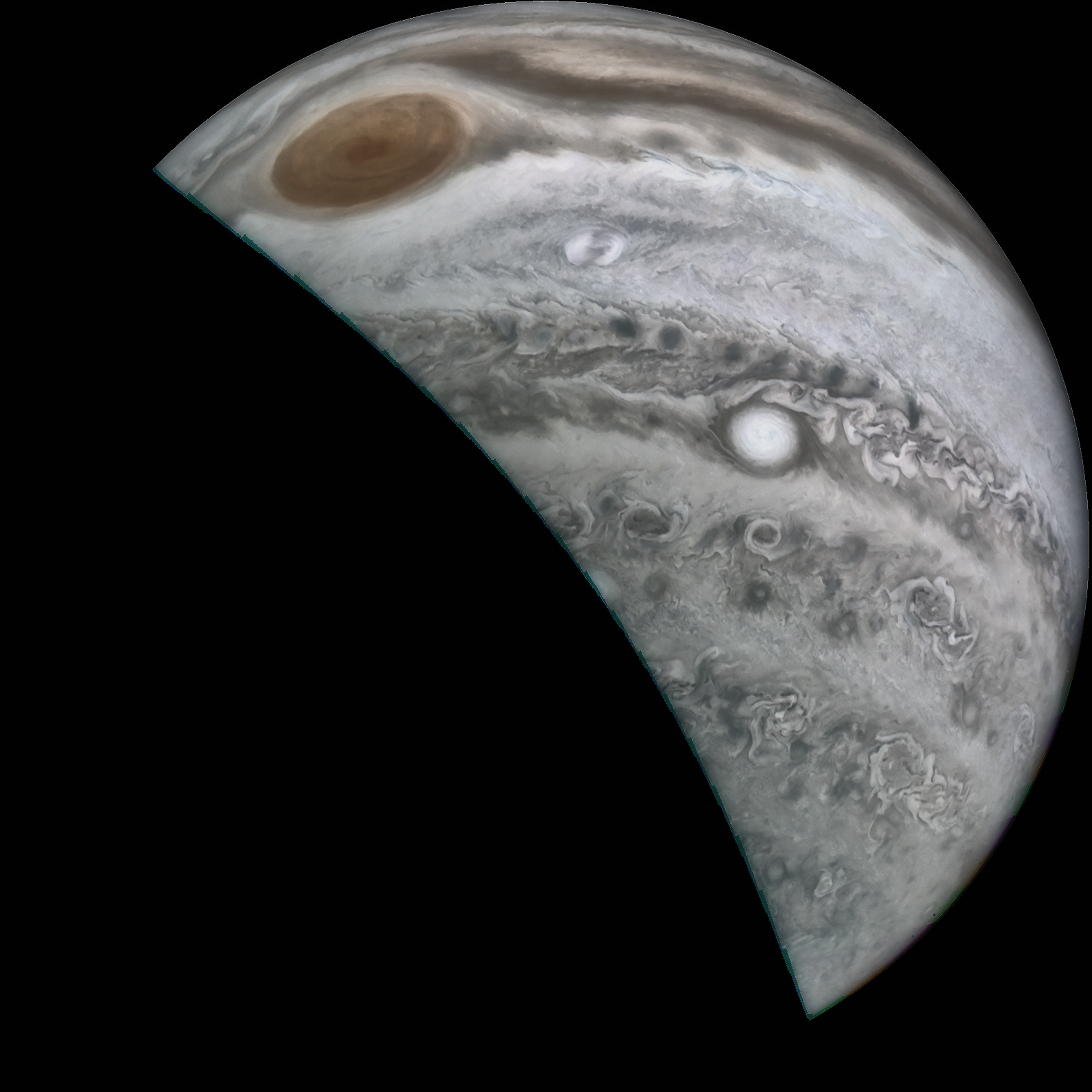 High contrast enhancement of Great Red Spot and white oval features, along with cloud turbulence.