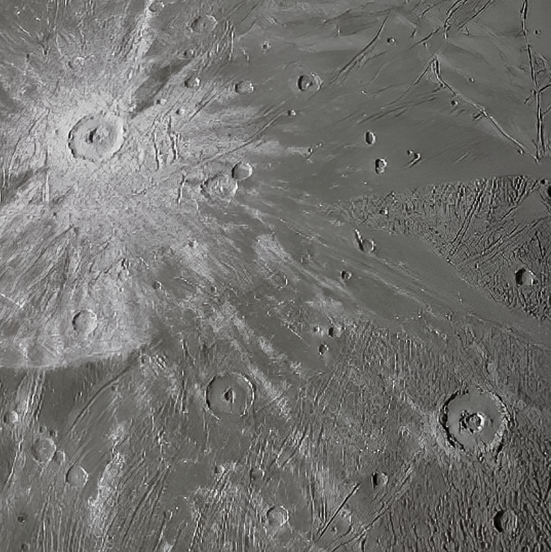 A close-up view of Ganymede taken by Juno spacecraft during its June 7, 2021, flyby of the moon. The prominent craters, Tros (upper left), Bau (bottom right) and other surface features can easily be seen in this cropped image.