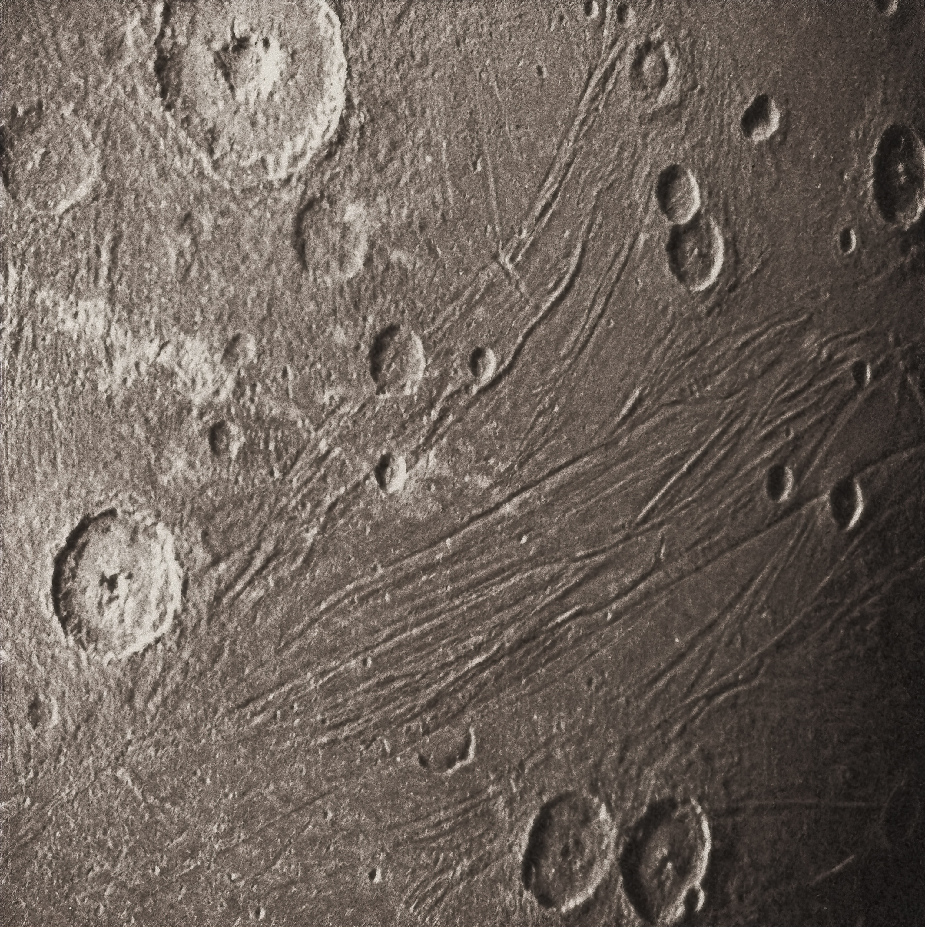 Upscaled and enhanced version of Ganymede_SRU_darkside. Upscaled to 6X with Topaz Gigapixel AI (multiple scaling results combined). Scanlines retouched out and image colorized and enhanced for a more naturalistic look.