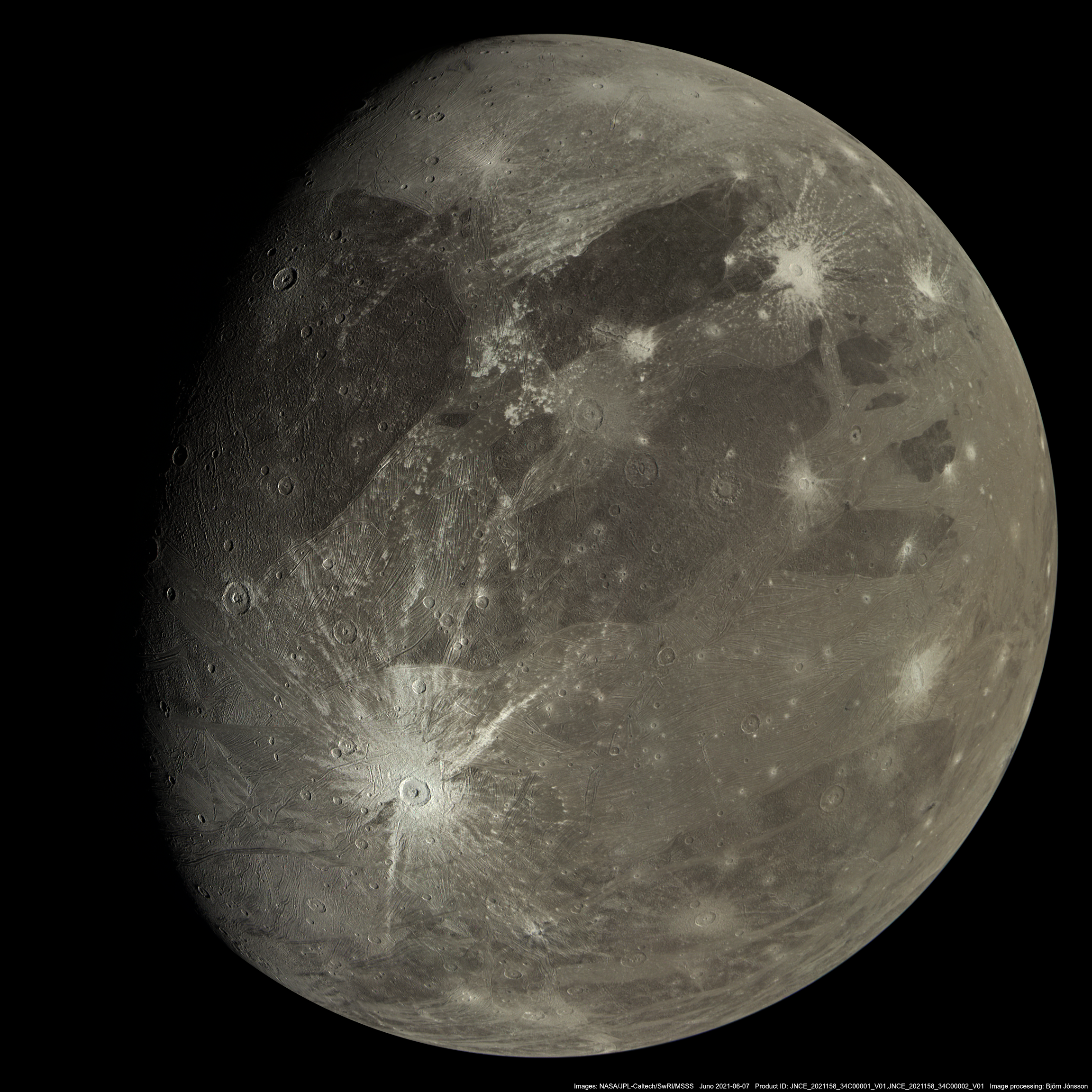 An approximately true color/contrast mosaic of Ganymede images pj34_01 and pj34_02. The viewing geometry for image pj34_02 was used for the mosaic. The color is mainly based on Ganymede's global visible light spectrum but it is somewhat subjective and approximate. Since an accurately reconstructed trajectory for Juno hasn't been released yet the mosaic might have some very minor geometric inaccuracies that will be corrected in a later, updated version if necessary.
