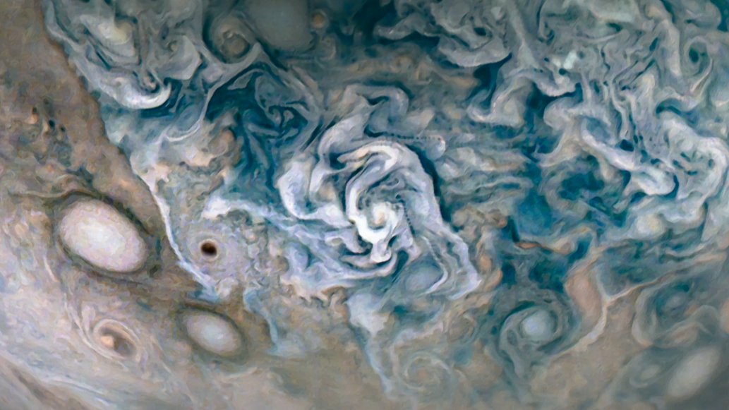 Processed using the JunoCam imager's PJ34 JET N5 raw images and data from NASA's Juno spacecraft flyby on June 8, 2021. Enhanced to highlight features, clouds, colours, and the beauty of Jupiter. Artist's impression - not representative of true colour.