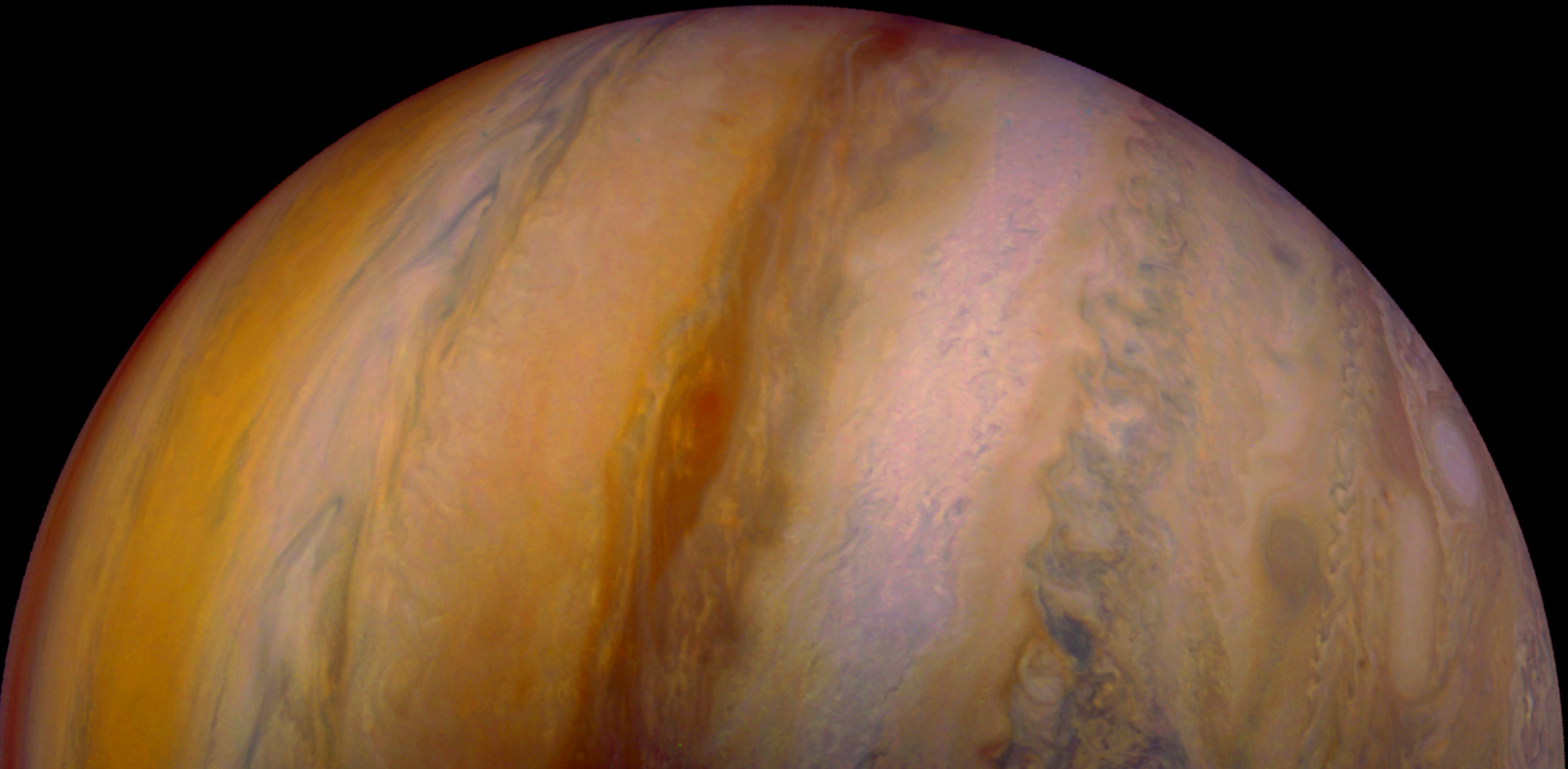 Junocam pixels are 12 bits deep from the camera but are converted to 8 bits inside the instrument using a lossless "companding" table, a process similar to gamma correction, to reduce their size. All Junocam products on the missionjuno website are in this 8-bit form as received on Earth. Scientific users interested in radiometric analysis should use the "RDR" data products archived with the Planetary Data System, which have been converted back to a linear 12-bit scale.