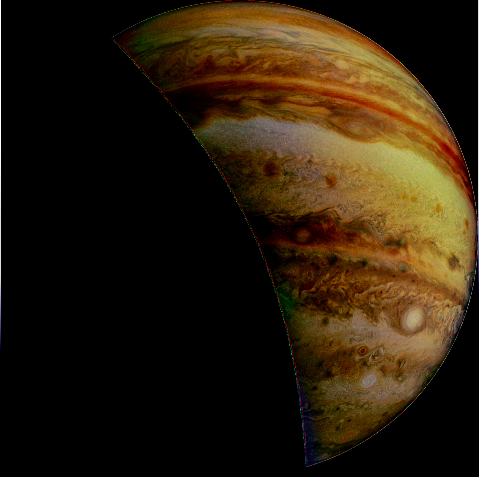 Junocam pixels are 12 bits deep from the camera but are converted to 8 bits inside the instrument using a lossless "companding" table, a process similar to gamma correction, to reduce their size. All Junocam products on the missionjuno website are in this 8-bit form as received on Earth. Scientific users interested in radiometric analysis should use the "RDR" data products archived with the Planetary Data System, which have been converted back to a linear 12-bit scale.