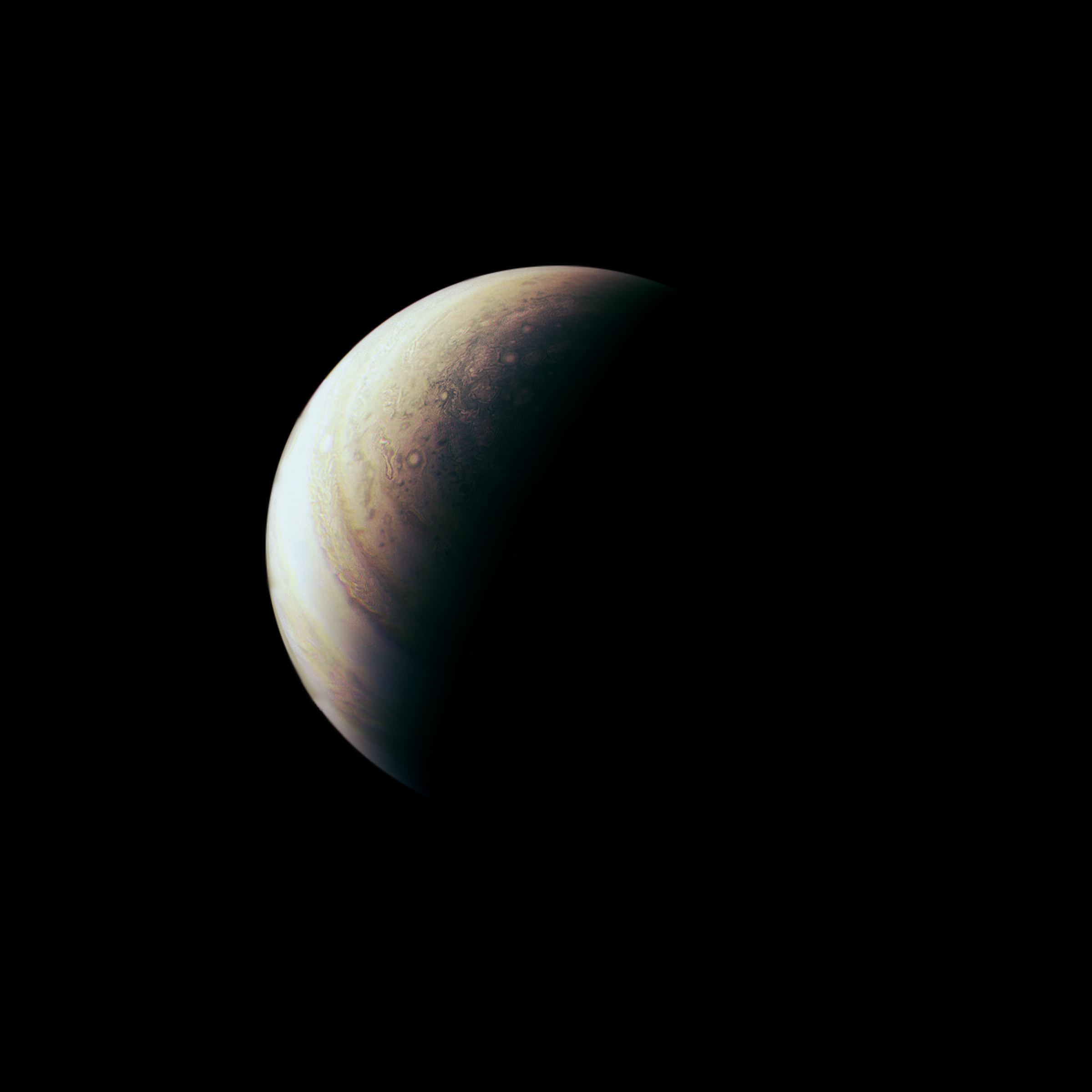 Junocam pixels are 12 bits deep from the camera but are converted to 8 bits inside the instrument using a lossless "companding" table, a process similar to gamma correction, to reduce their size. All Junocam products on the missionjuno website are in this 8-bit form as received on Earth. Scientific users interested in radiometric analysis should use the "RDR" data products archived with the Planetary Data System, which have been converted back to a linear 12-bit scale.