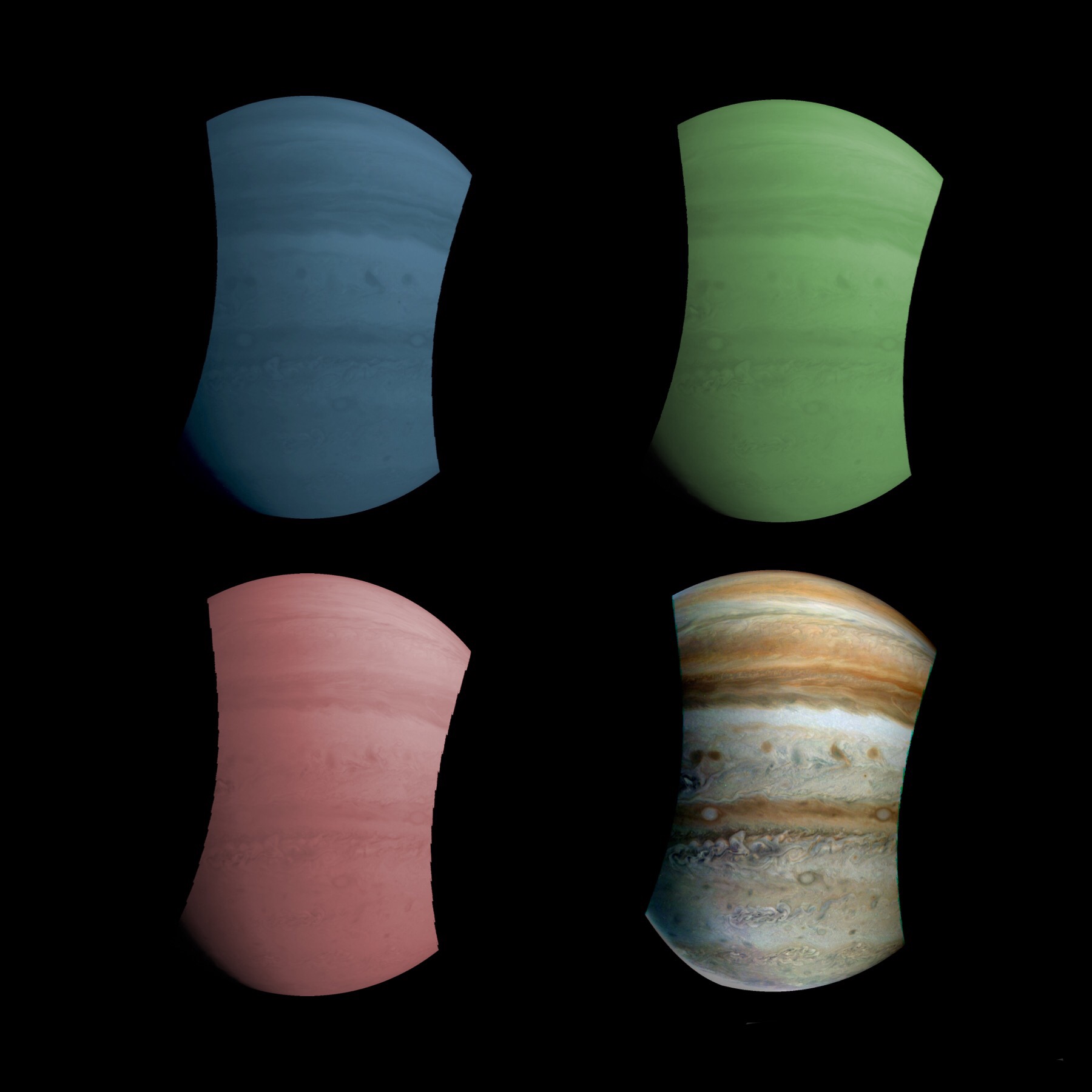 A special note about the Earth Flyby mission phase images: these were acquired in 2013 when Juno flew past Earth. Examples of processed images are shown; most contributions are from amateurs.
