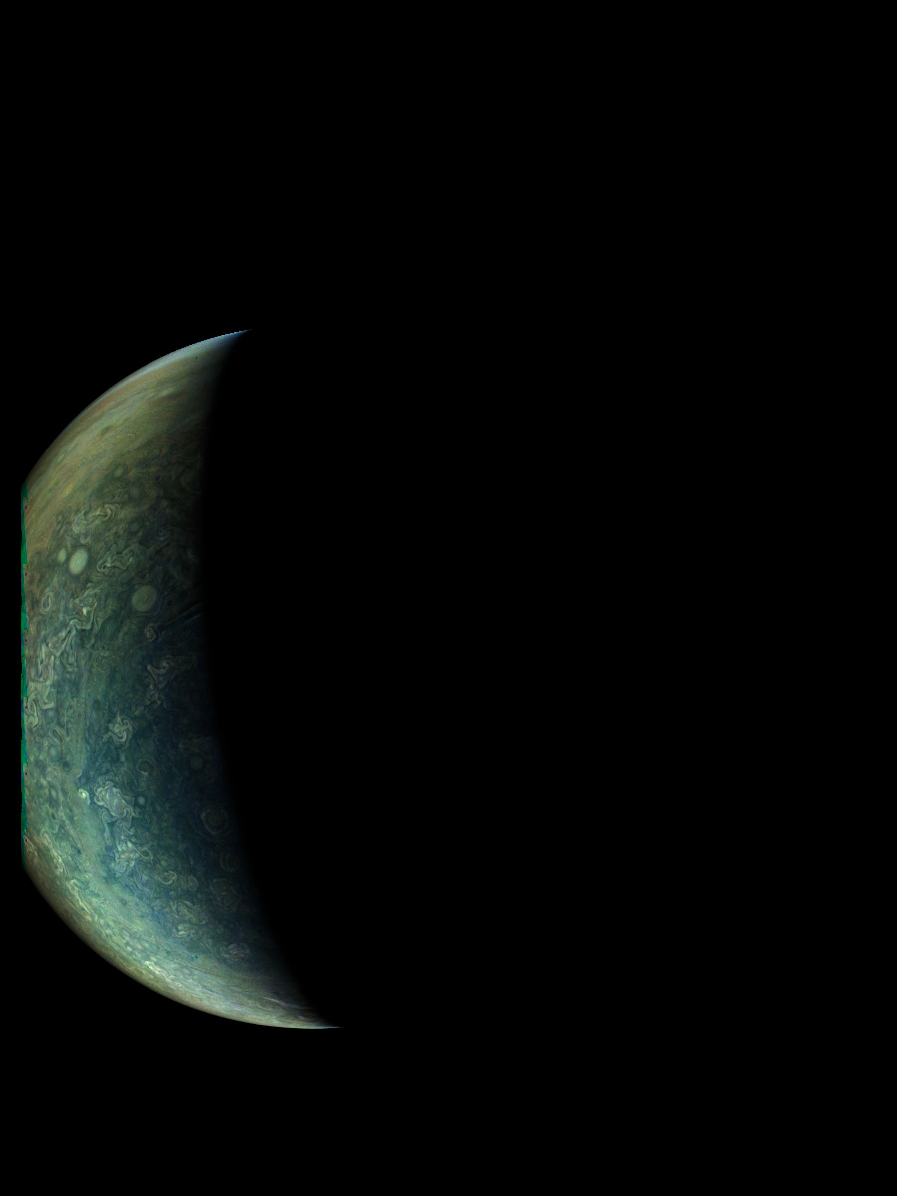 The image shows Jupiter from the north. It's mostly illumination adjusted, then strongly enhanced by using the 4th power of radiometric data. Then some illumination effect is added again in order to recover the 3D appearence. The resolution of the image is similar to JunoCam's resolution.