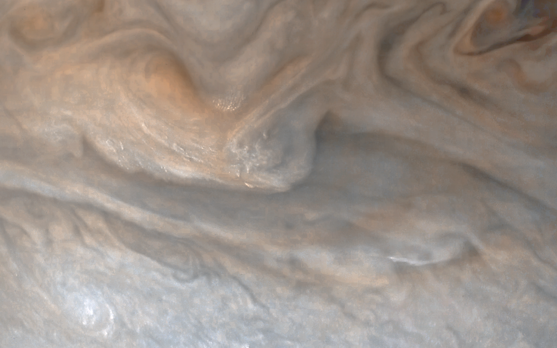 Area of turbulent clouds in the region of the jet stream marking the southern boundary of the South Equatorial Belt. An eddy seems to be encouraging convection, with numerous clouds bubbling through the main cloud deck.
