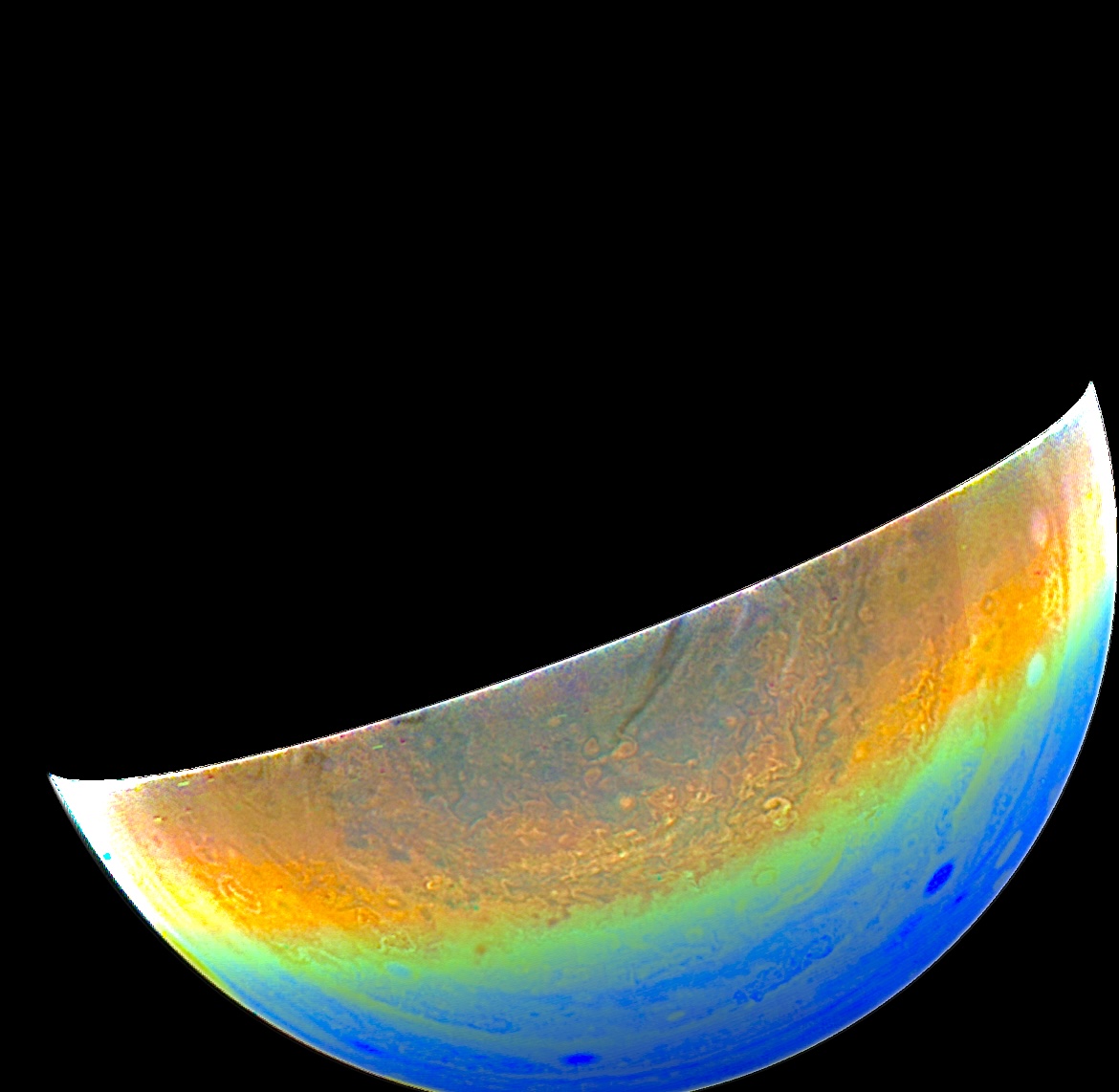 With enhances, it can be seen that there are many colorful bands in contrast with each other. They are making a rainbow-like picture as well! There are some spots towards the east side of the planet. It is also seen that there are a few swirls in the center that are noticed in a brighter light.