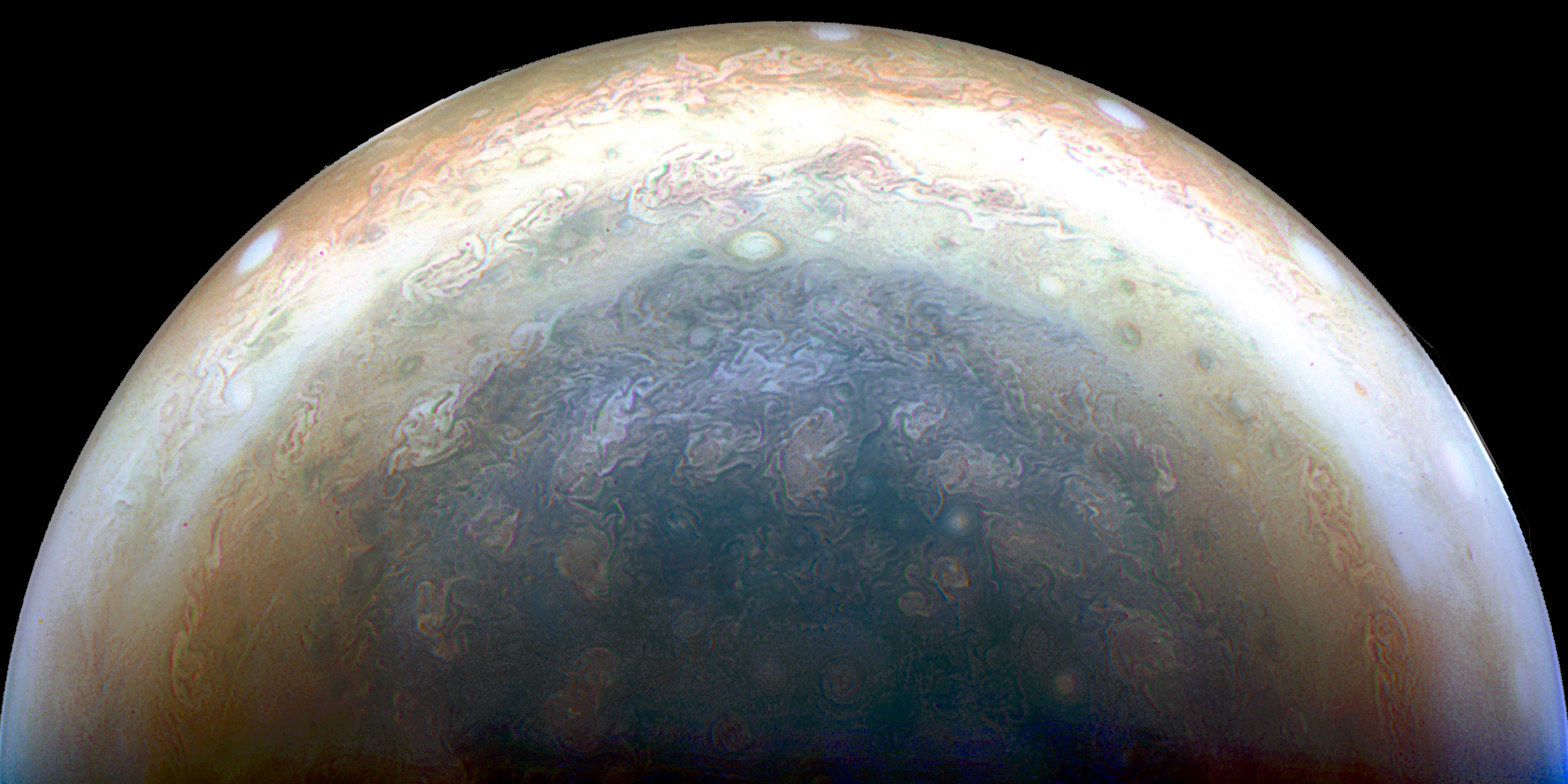 Junocam pixels are 12 bits deep from the camera but are converted to 8 bits inside the instrument using a lossless "companding" table, a process similar to gamma correction, to reduce their size. All Junocam products on the missionjuno website are in this 8-bit form as received on Earth. Scientific users interested in radiometric analysis should use the "RDR" data products archived with the Planetary Data System, which have been converted back to a linear 12-bit scale.