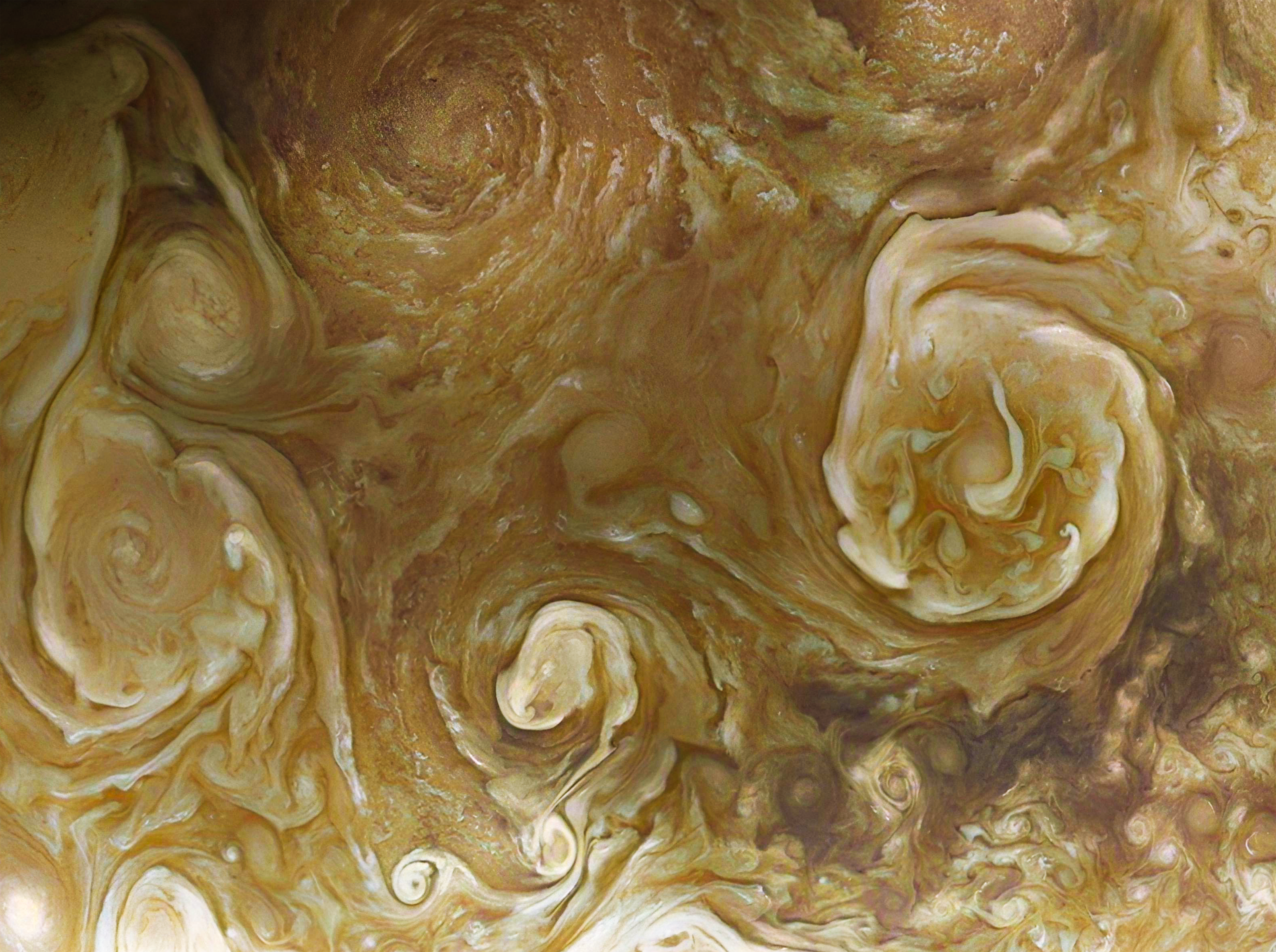 A closer look at some of the prominent Northern Circumpolar Cyclones on Jupiter. This false color image was created from raw image data taken by Junocam on December 15, 2022 (Perijove 47). At the time, Juno was approximately 25600km above the cloud tops.