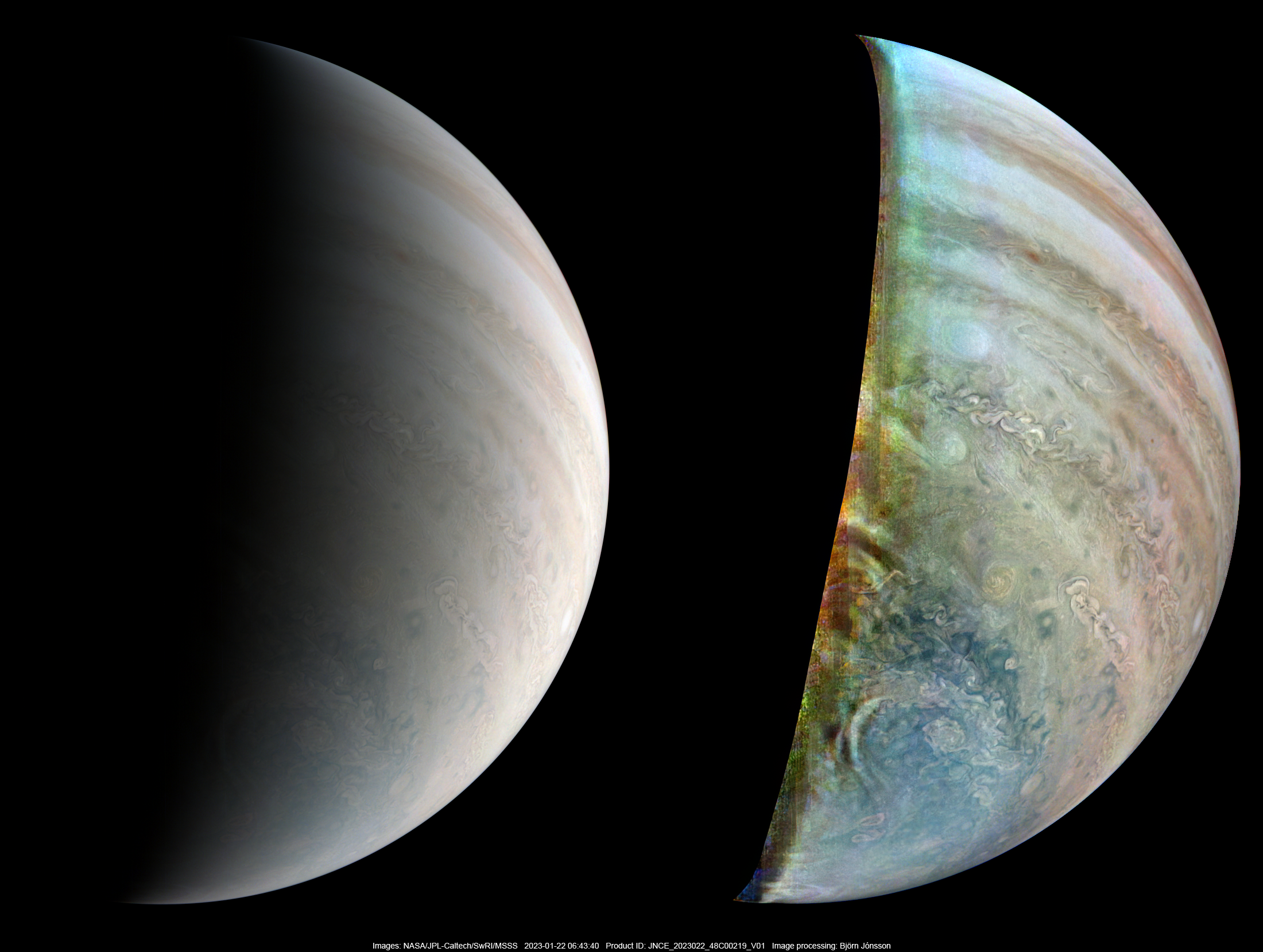An approximately true color/contrast version of image PJ48_219 (left) and a heavily processed enhanced version (right) showing Jupiter's southern hemisphere. North is up.