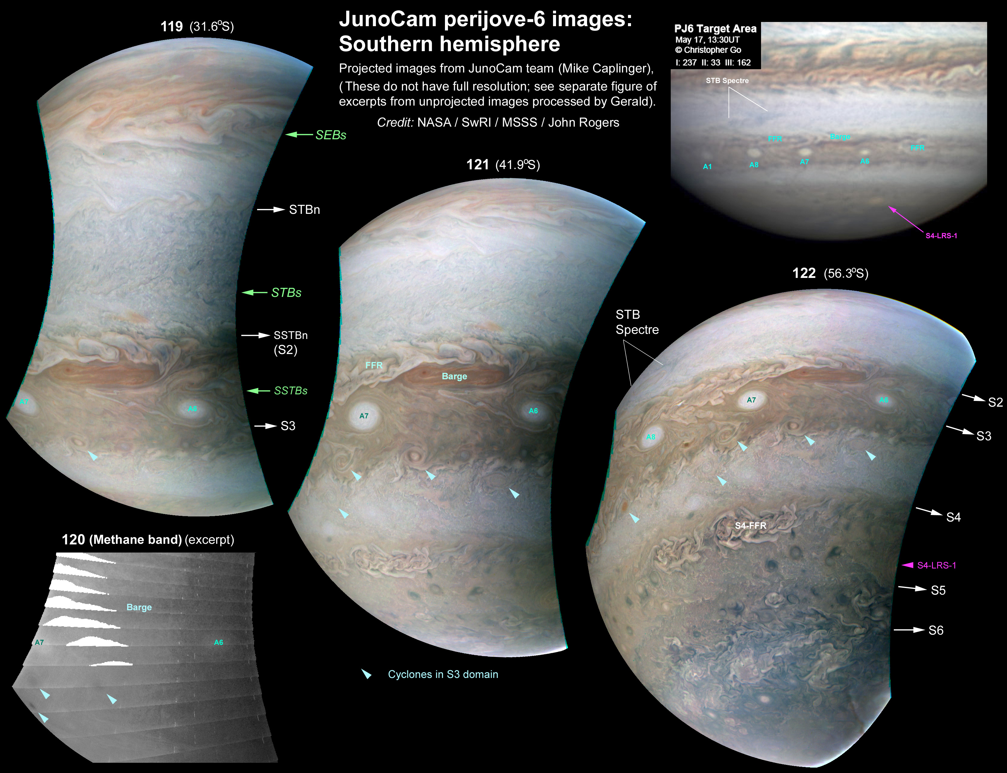 Annotated images of the high southern temperate latitudes. In the S2 domain, the same sector is seen as at PJ5, with ovals A6 and A7. But a dark streak between them at PJ5 has grown into a striking red-brown barge at PJ6, with bright strips from an adjacent turbulent region (FFR) overlapping it.
