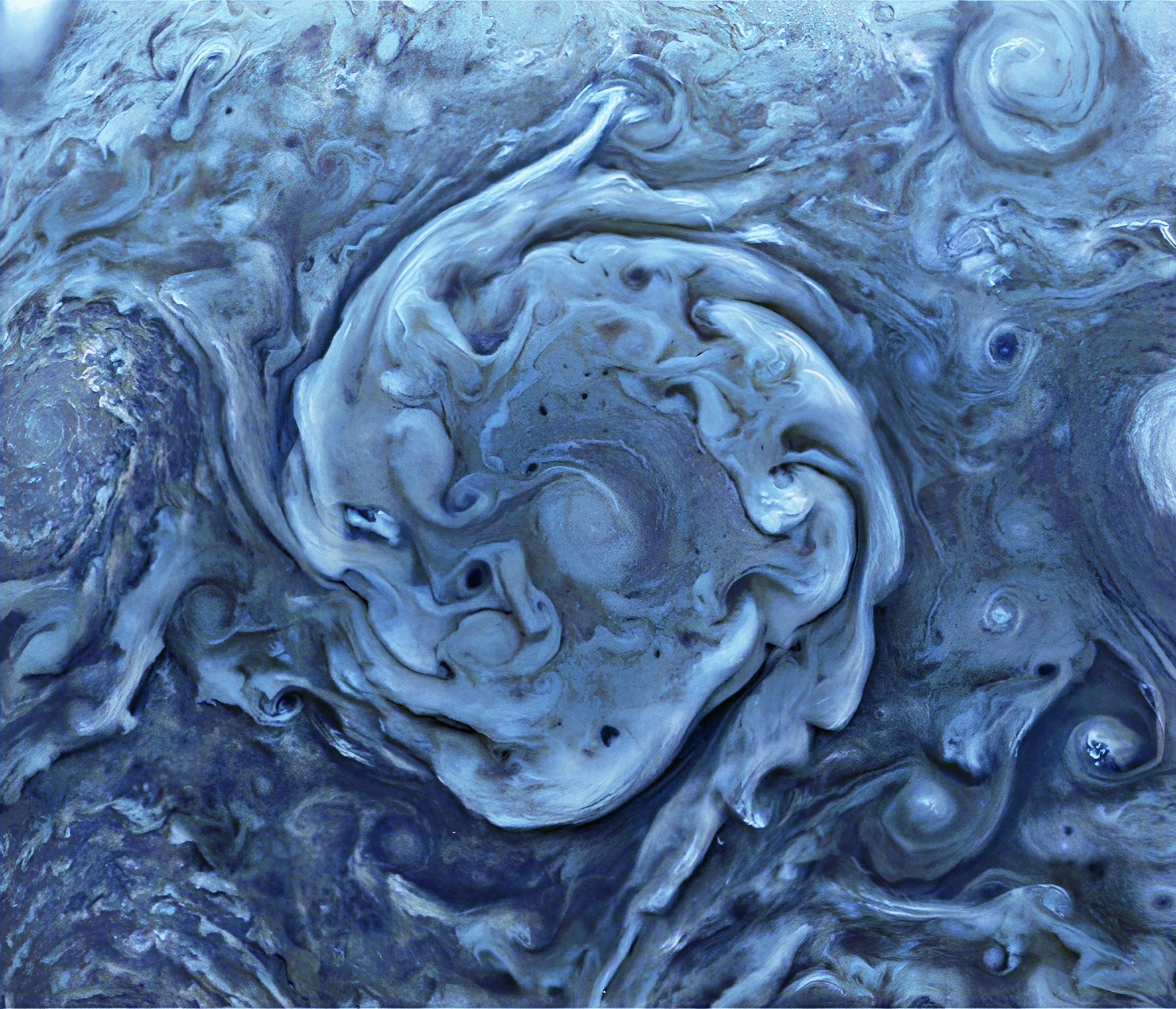 Northern Circumpolar Cyclone in Exaggerated Detail: Created from a raw image captured by JunoCam on June 23, 2023. Enhanced using GIMP. Juno was at an altitude of about 15,000 km from the cloud tops when the photo was taken.