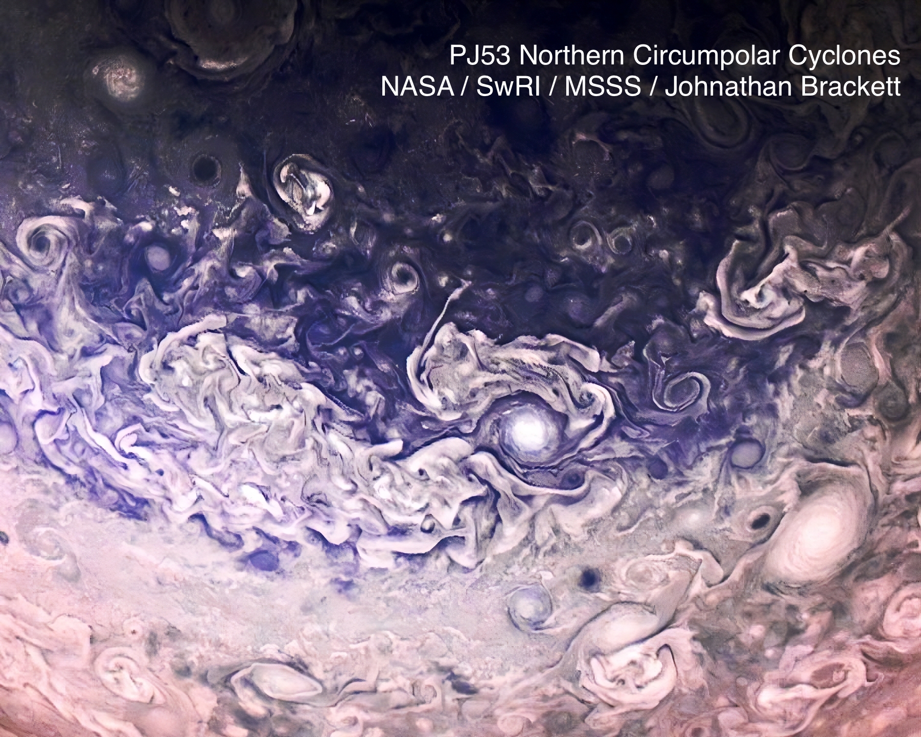 Color enhanced and cropped image of cyclones near Jupiter’s North Pole.