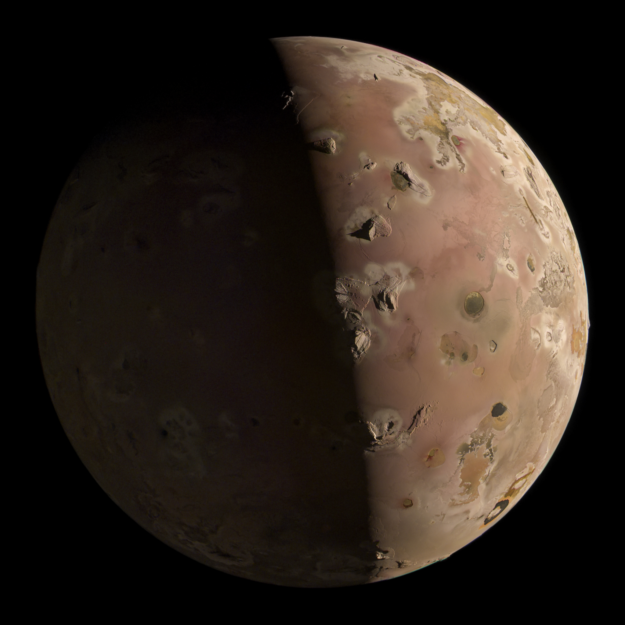 Approximate true color image of Io's north polar region during the PJ57 flyby. The Jupiter-lit shadowed side was slightly brightened to bring out additional details. The image was assembled from the raw framelets using a custom python script for preprocessing and PTGui for stitching.