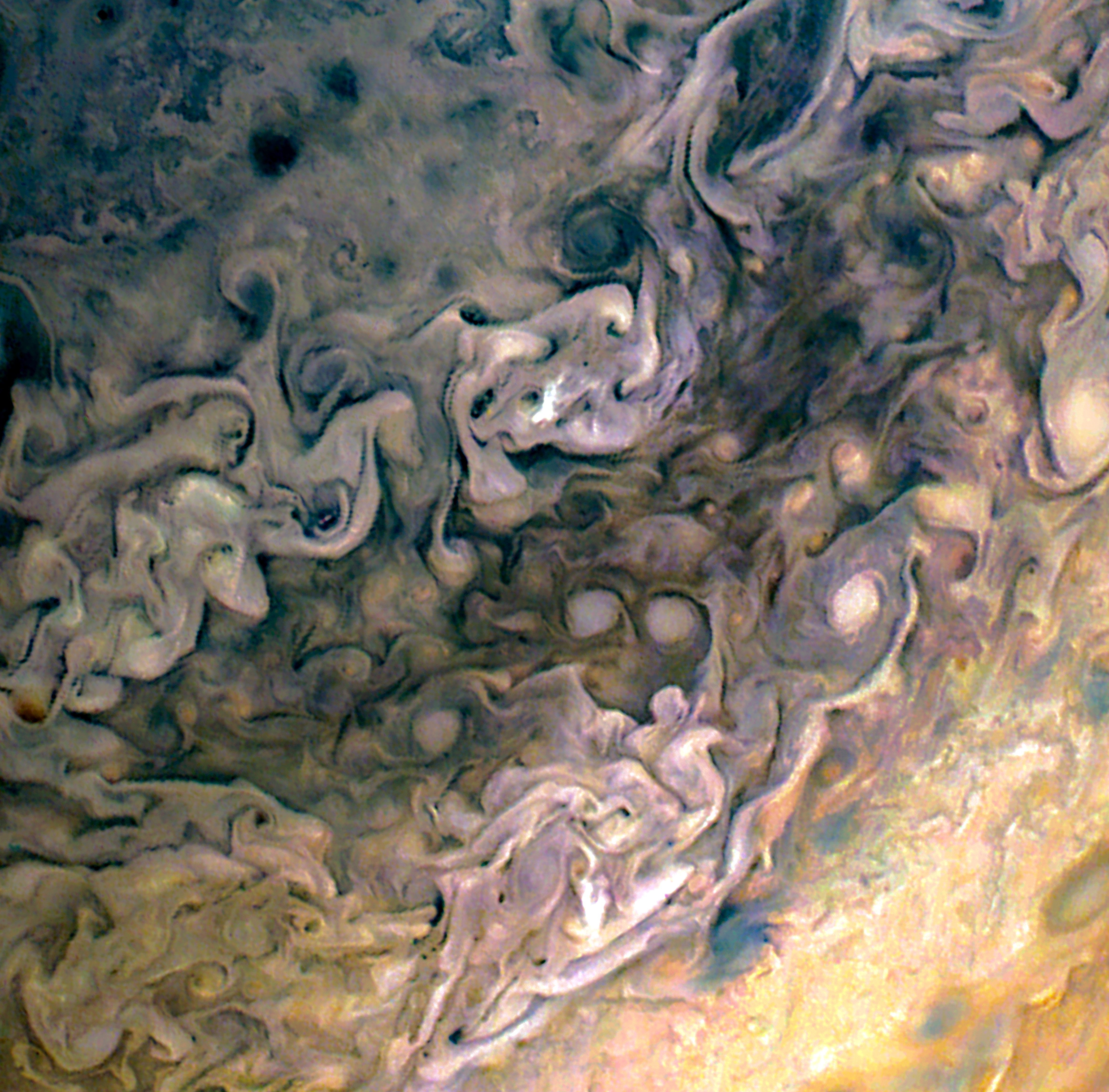 Closeup of Jupiter's far north region consisting of turbulent clouds and storms