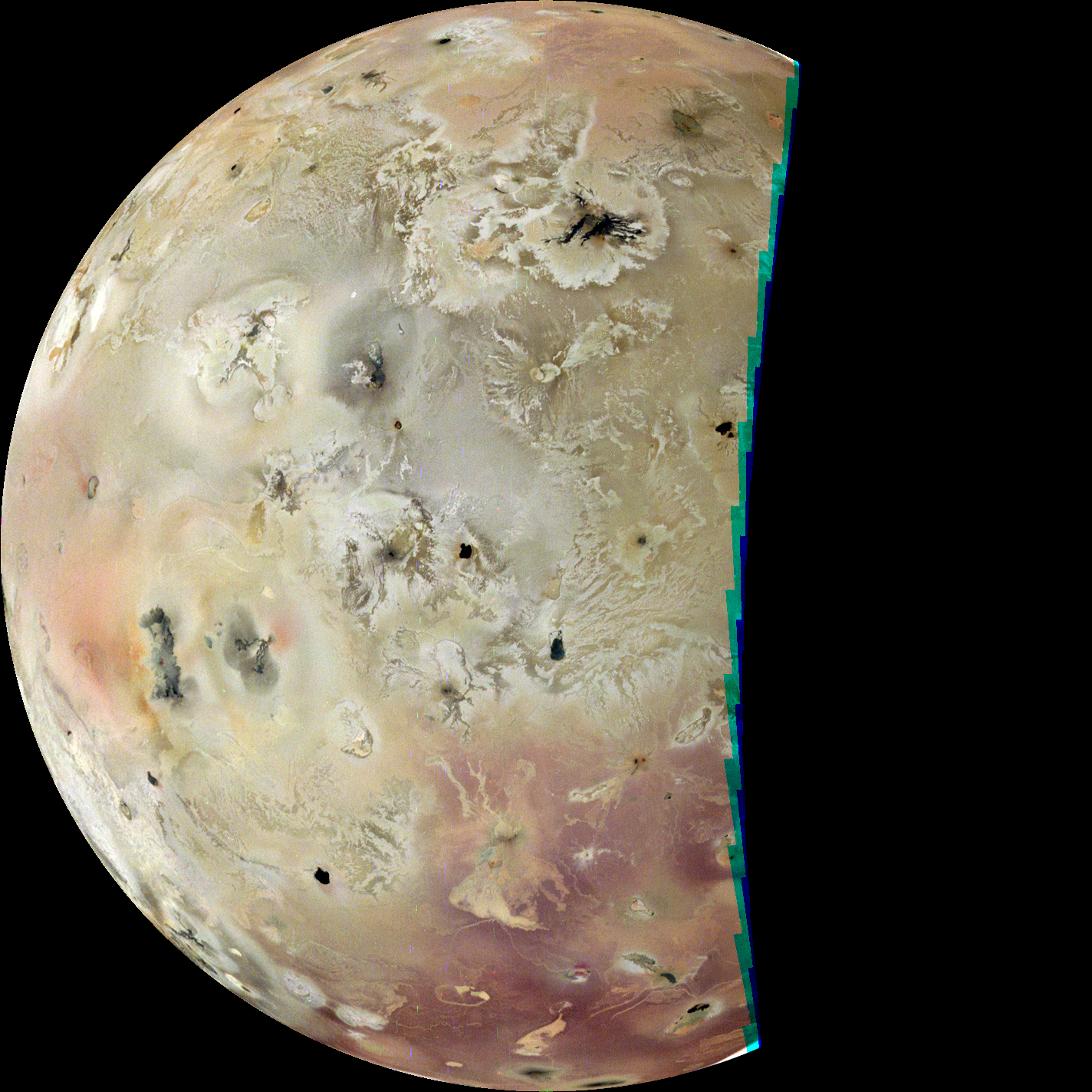 Io's sub-Jovian hemisphere is revealed in detail for the first time since Voyager 1 flew through the Jupiter system in March 1979. This image shows Io's nightside illuminated by sunlight reflected off Jupiter's cloud tops. Several surface changes are visible include a reshaping of the compound flow field at Kanehekili (center left) and a new lava flow to the east of Kanehekili. This image has a pixel scale of 1.6 km/pixel.