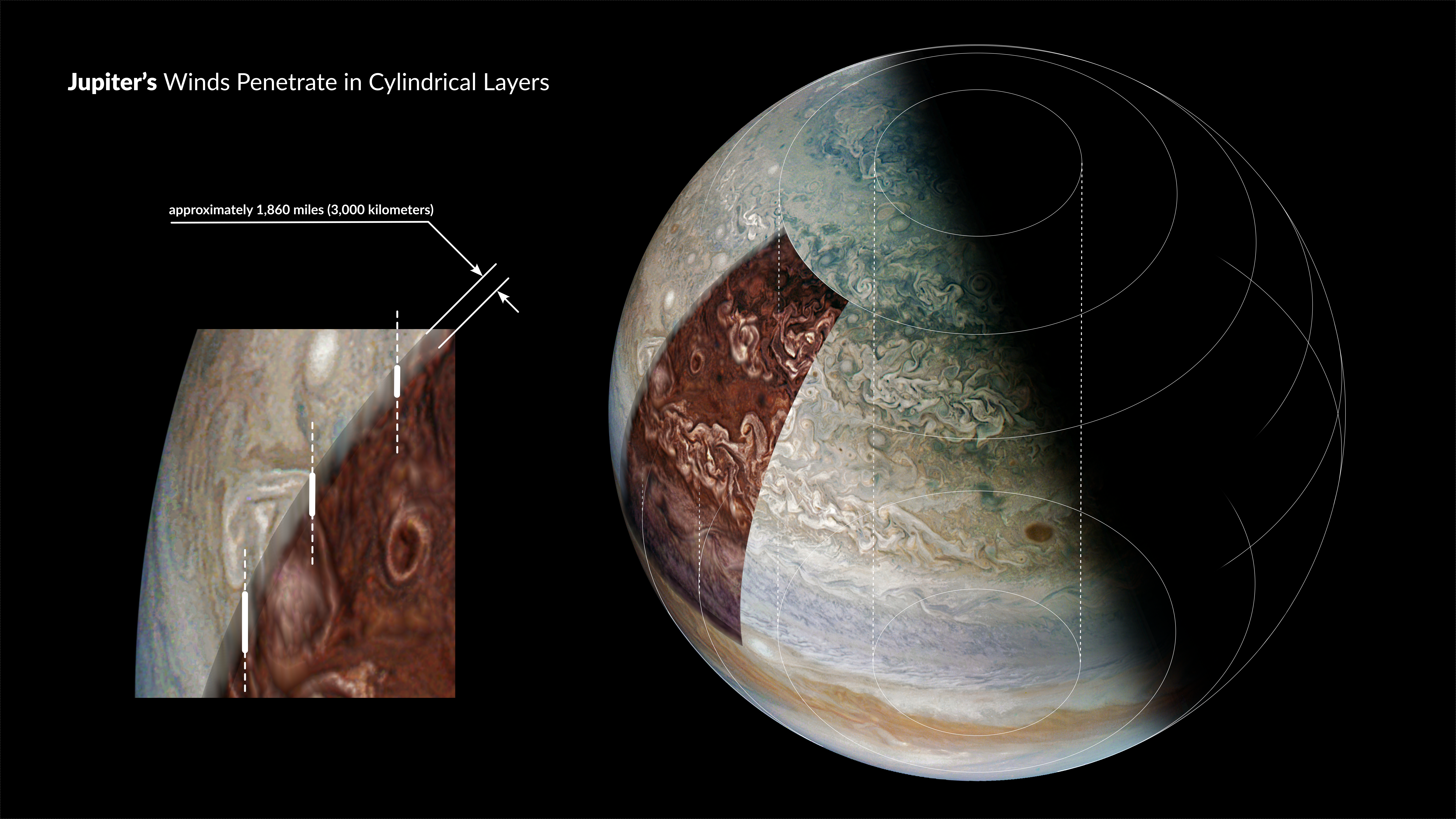 Artistic visualization of winds penetrating Jupiter in a cylindrical manner. I used material JNCE_2024034_58C00053_V01 from the PERIJOVE 58 mission phase.