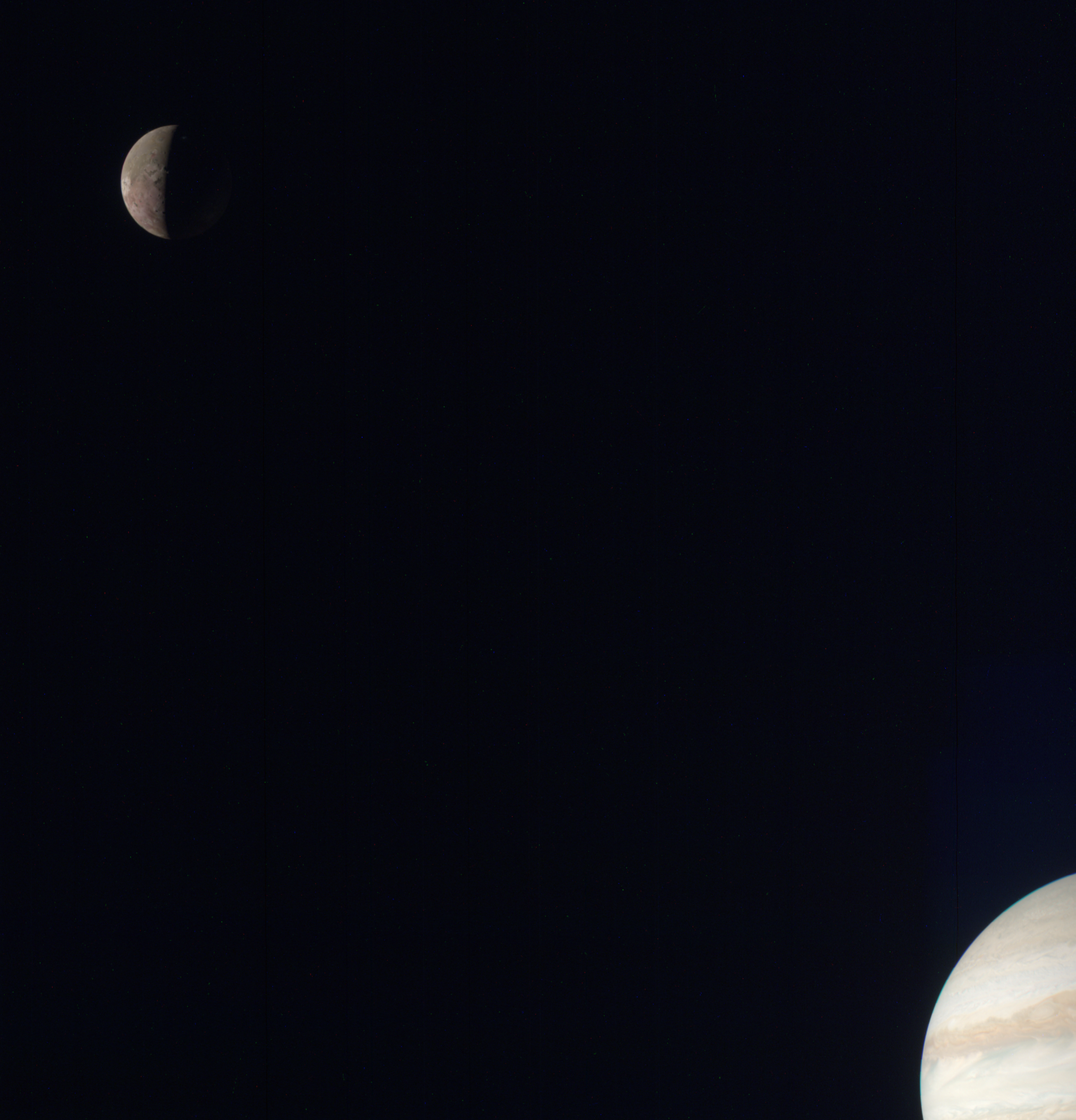 Io w/plume and Jupiter PJ60_45 Crop, Natural-ish Color/Contrast