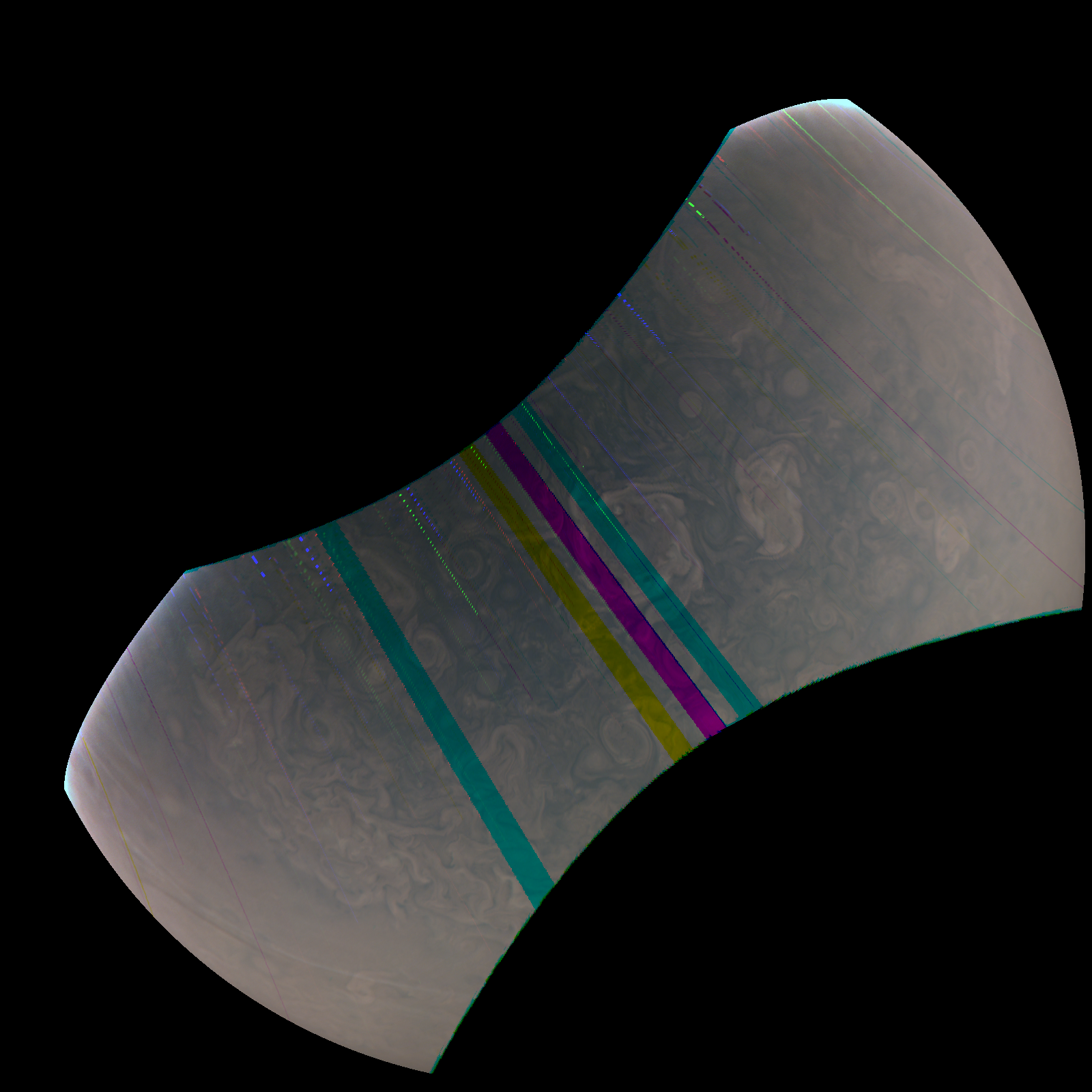 Junocam pixels are 12 bits deep from the camera but are converted to 8 bits inside the instrument using a lossless "companding" table, a process similar to gamma correction, to reduce their size. All Junocam products on the missionjuno website are in this 8-bit form as received on Earth. Scientific users interested in radiometric analysis should use the "RDR" data products archived with the Planetary Data System, which have been converted back to a linear 12-bit scale.