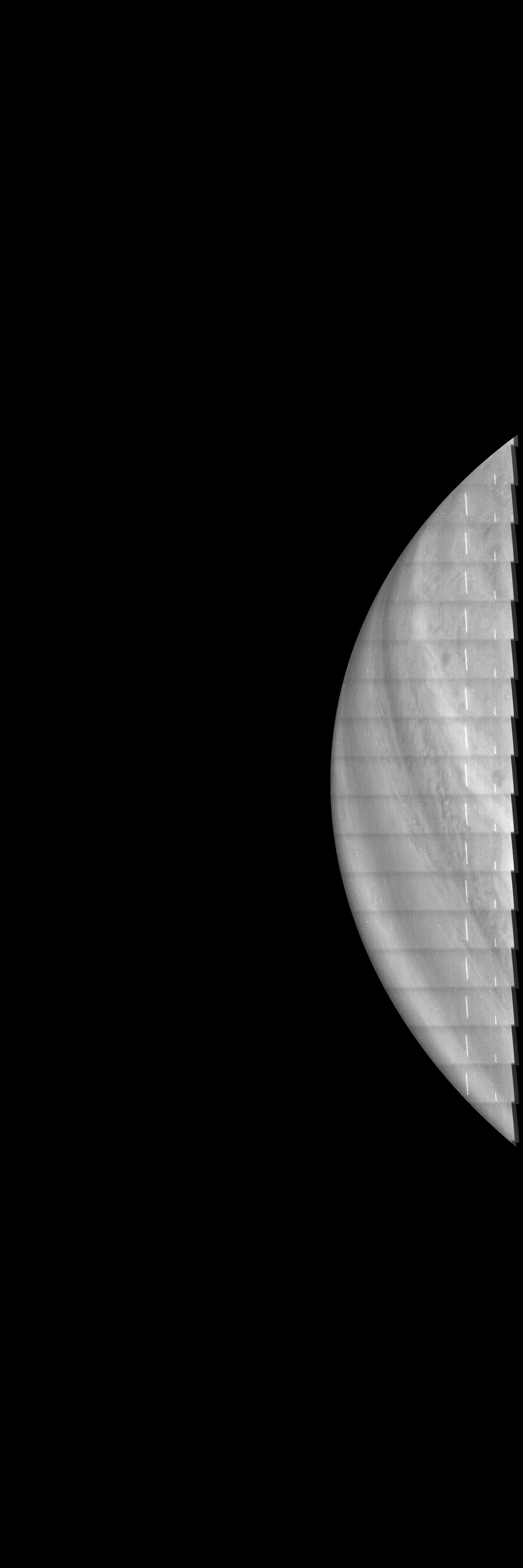Resolution is 30 pixels per degree in an equidistant cylindrical frame centered to the camera at image stop time, with an axis parallel to Juno's spin axis. The rendered field of view is 60x180 degrees.