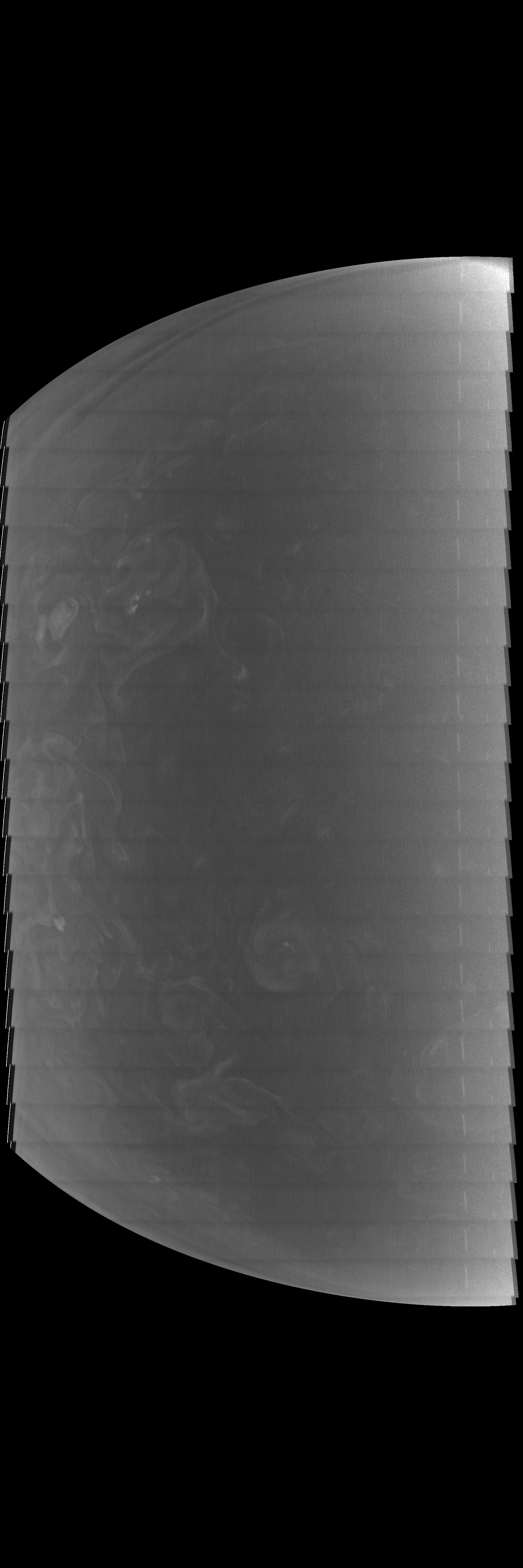 This methane-band image is reprojected according to a preliminary geometrical camera model, cleaned from some of the camera artifacts and energetic particle hits, approximately illumination adjusted with a 3rd degree polynomial BRDF over the cosines of the incidence and emission angle on the basis of PJ50 images, and displayed with gamma=1 with respect to the square root of radiometric values.