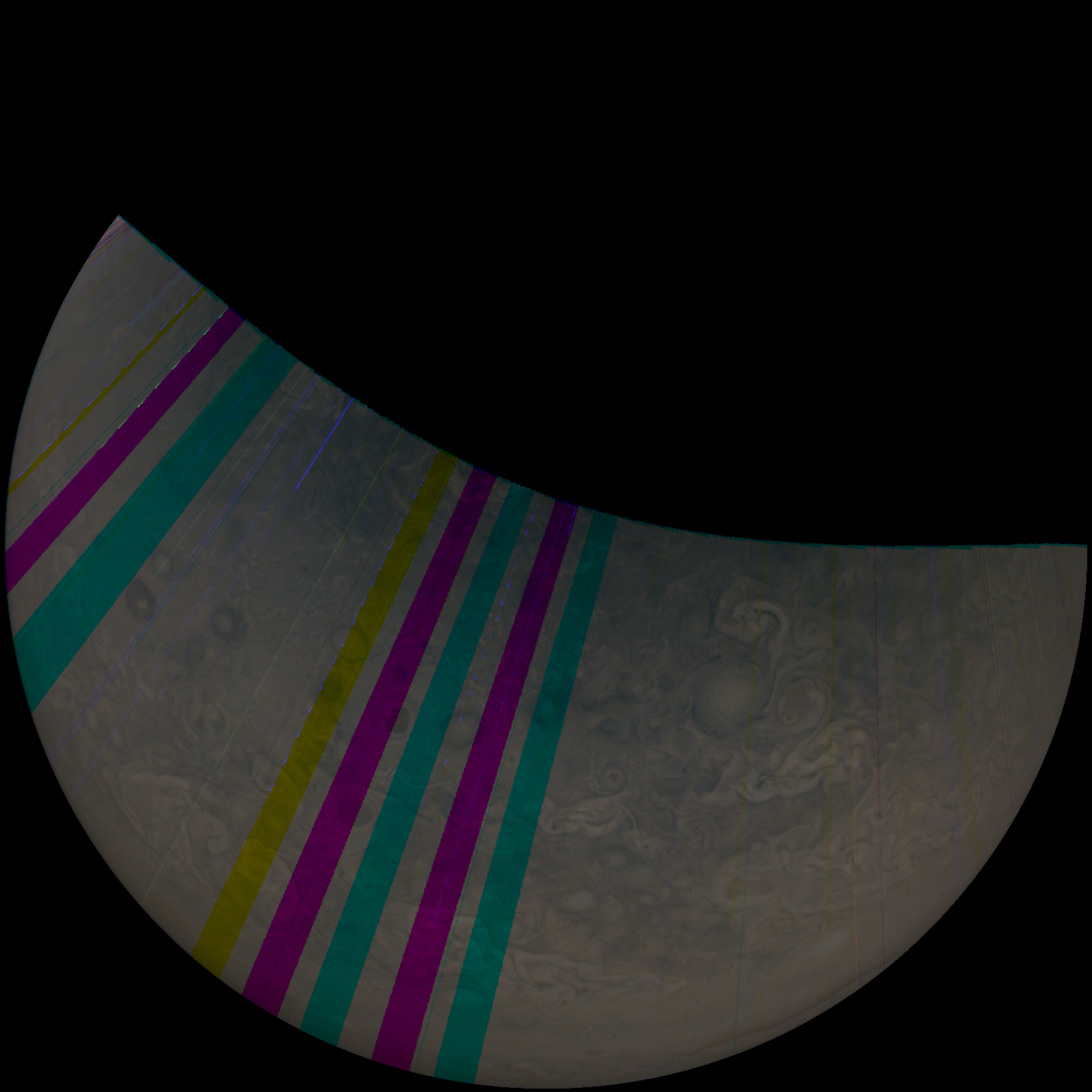 Junocam pixels are 12 bits deep from the camera but are converted to 8 bits inside the instrument using a lossless "companding" table, a process similar to gamma correction, to reduce their size. All Junocam products on the missionjuno website are in this 8-bit form as received on Earth. Scientific users interested in radiometric analysis should use the "RDR" data products archived with the Planetary Data System, which have been converted back to a linear 12-bit scale.