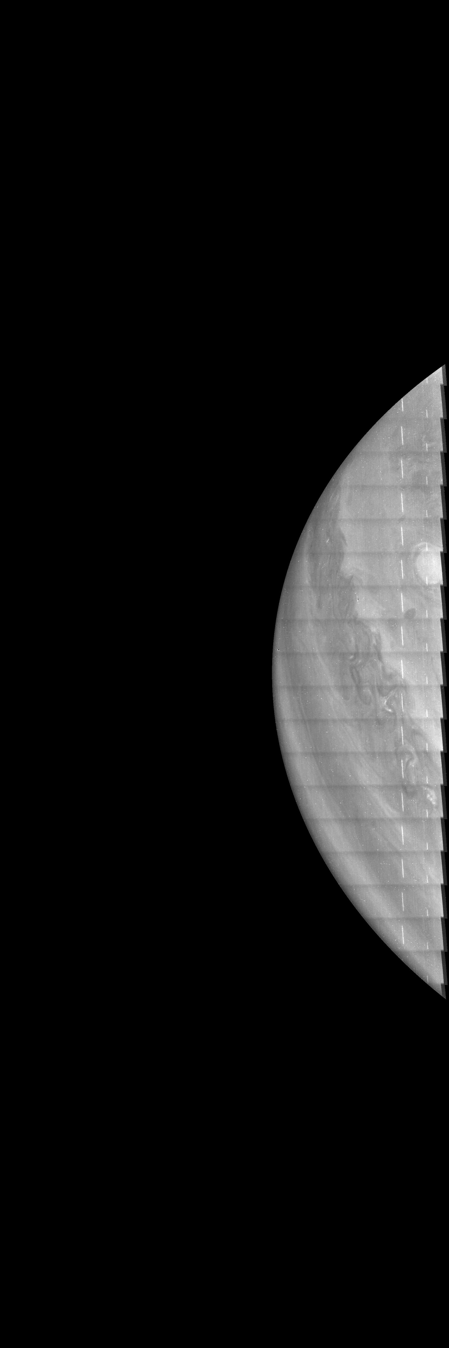 Resolution is 30 pixels per degree in an equidistant cylindrical frame centered to the camera at image stop time, with an axis parallel to Juno's spin axis. The rendered field of view is 60x180 degrees.