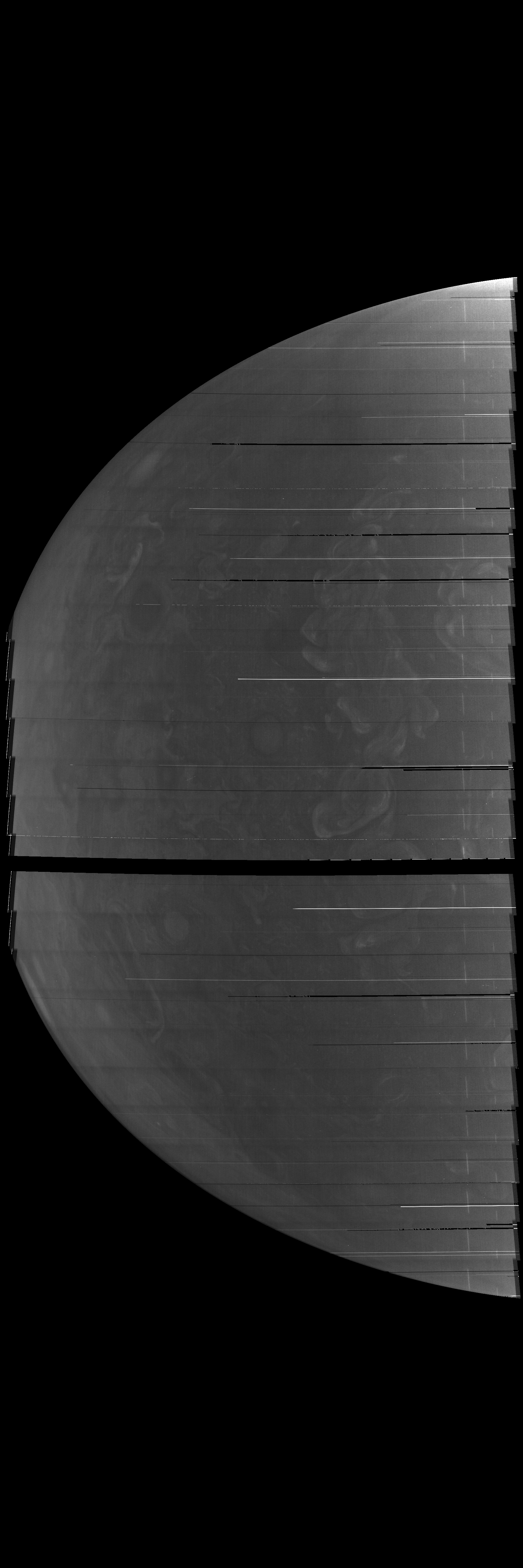 Resolution is 30 pixels per degree in an equidistant cylindrical frame centered to the camera at image stop time, with an axis parallel to Juno's spin axis. The rendered field of view is 60x180 degrees.