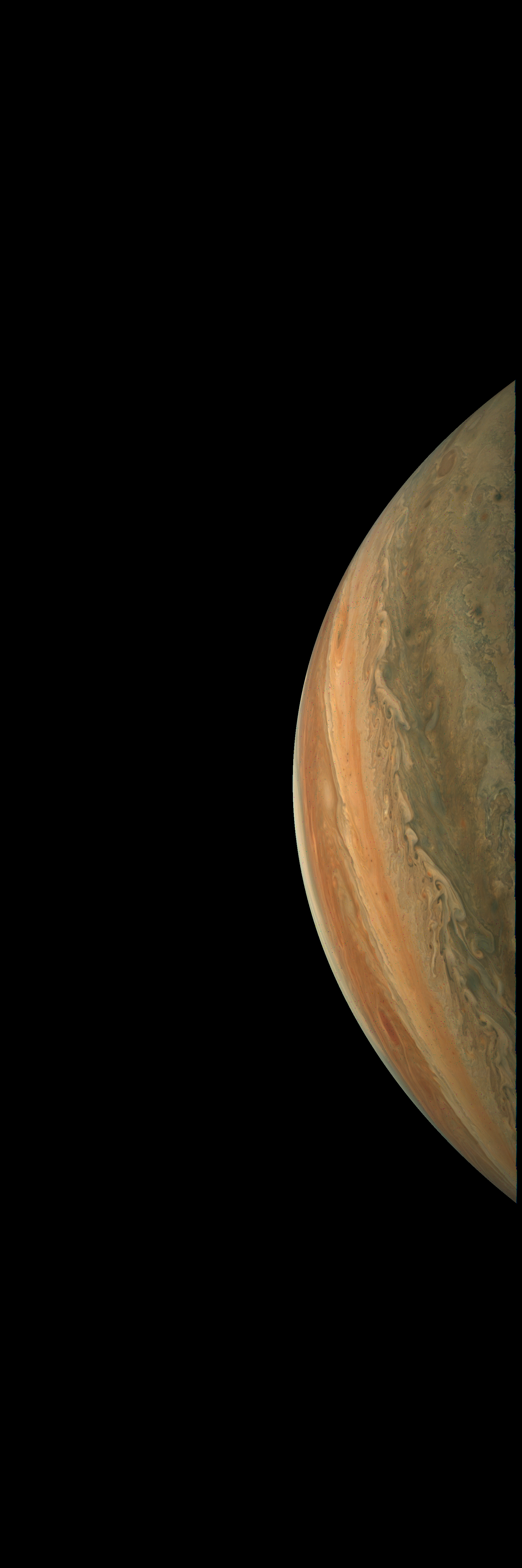 Junocam pixels are 12 bits deep from the camera but are converted to 8 bits inside the instrument using a lossless "companding" table, a process similar to gamma correction, to reduce their size. All Junocam products on the missionjuno website are in this 8-bit form as received on Earth. Scientific users interested in radiometric analysis should use the "RDR" data products archived with the Planetary Data System, which have been converted back to a linear 12-bit scale.