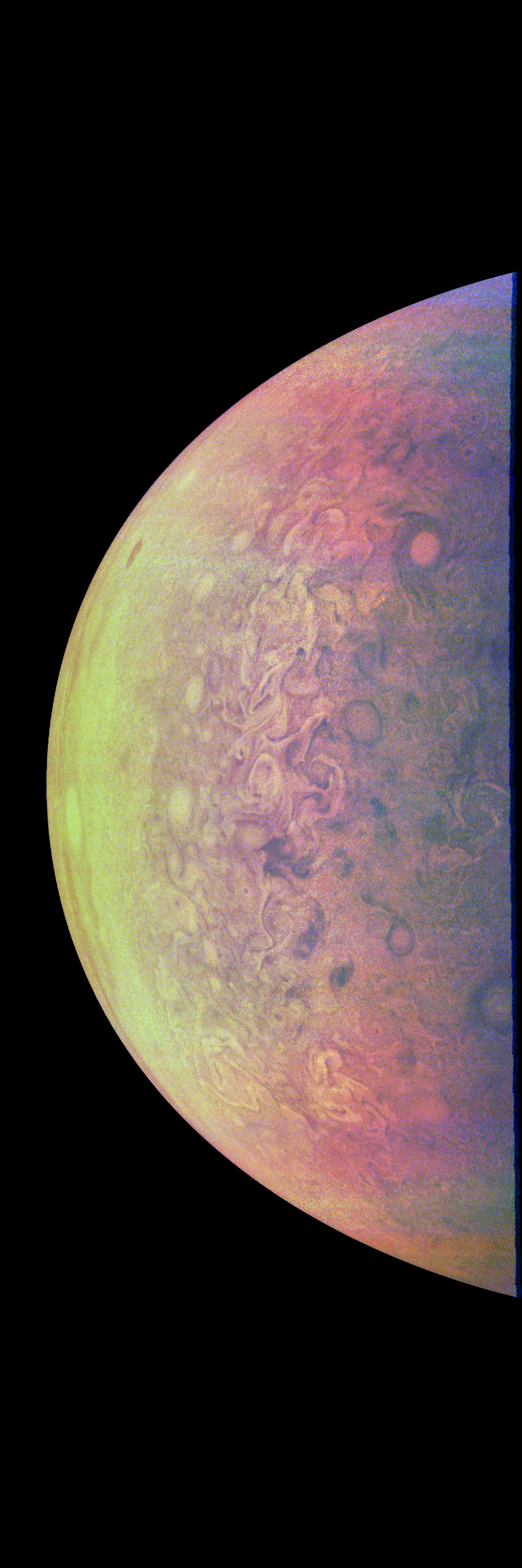Junocam pixels are 12 bits deep from the camera but are converted to 8 bits inside the instrument using a lossless "companding" table, a process similar to gamma correction, to reduce their size. All Junocam products on the missionjuno website are in this 8-bit form as received on Earth. Scientific users interested in radiometric analysis should use the "RDR" data products archived with the Planetary Data System, which have been converted back to a linear 12-bit scale.