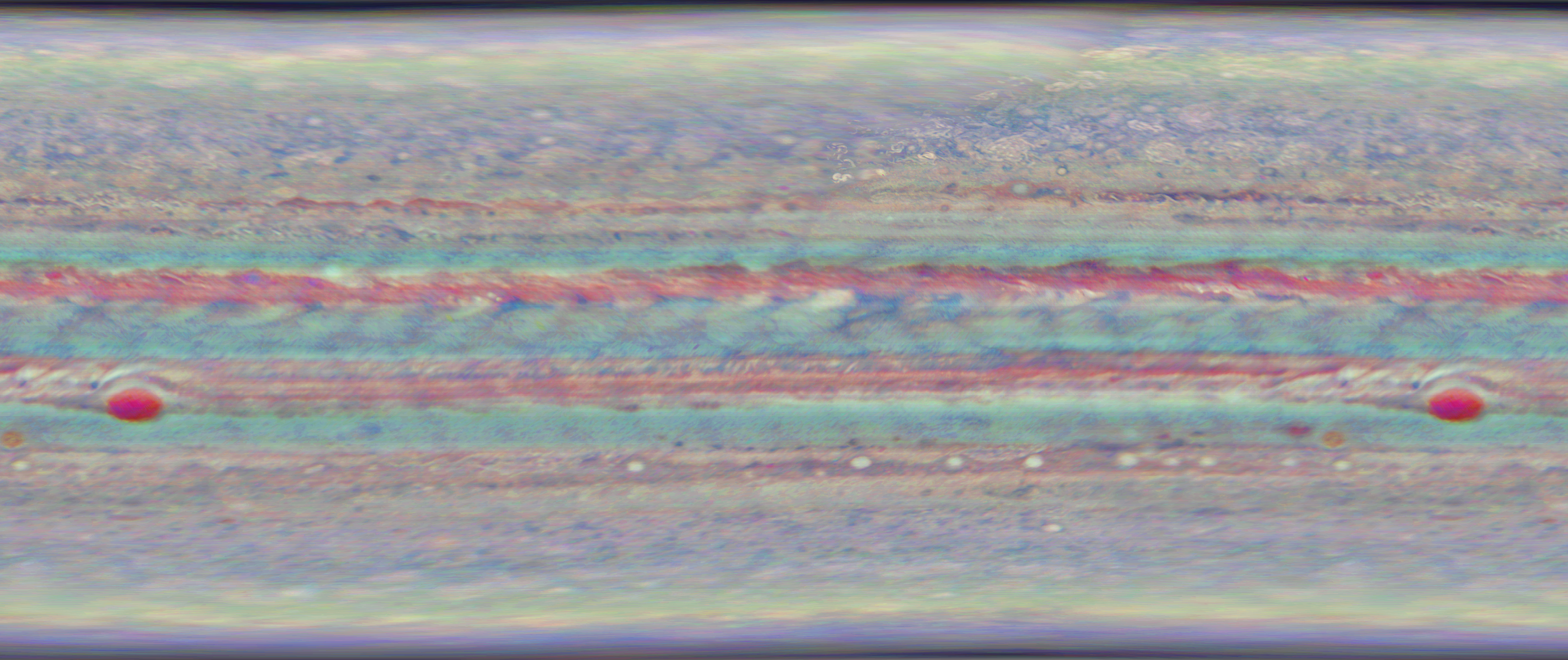 The resulting map underwent several post-processing steps: multiplying with the negative of the mean grey value over all pixels of the same latitude as a crude de-lamberting avoiding the brightess singularity near the poles, hipass-filtering (radius 100) to prepare for small-scale enhancement, then enhancing brightness and saturation by respective linear stretches.