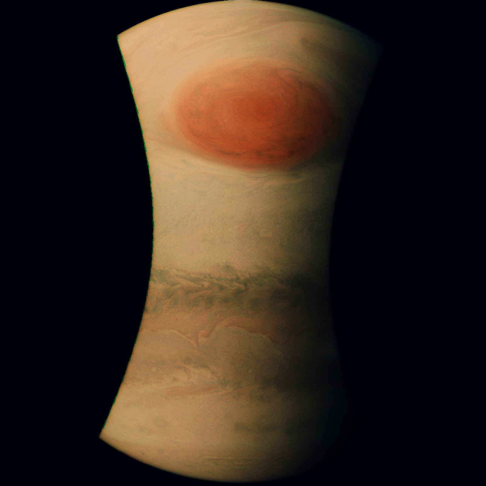 JUNO Great Red Spot image processed and enhanced to bring out detail and structure