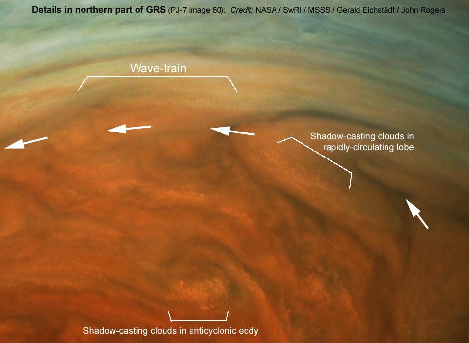 The unprecedented resolution of the close GRS images reveals clusters of little shadow-casting clouds, and a train of small-scale waves along the northern edge of the GRS (Figure 8); these have never before been seen in the GRS. The shadow-casting clouds appear orange, probably because they lie below the orange haze that gives the GRS its colour. (This is a crop from image 60, processed by Gerald. The white arrows indicate the approximate direction of the GRS circulation.)