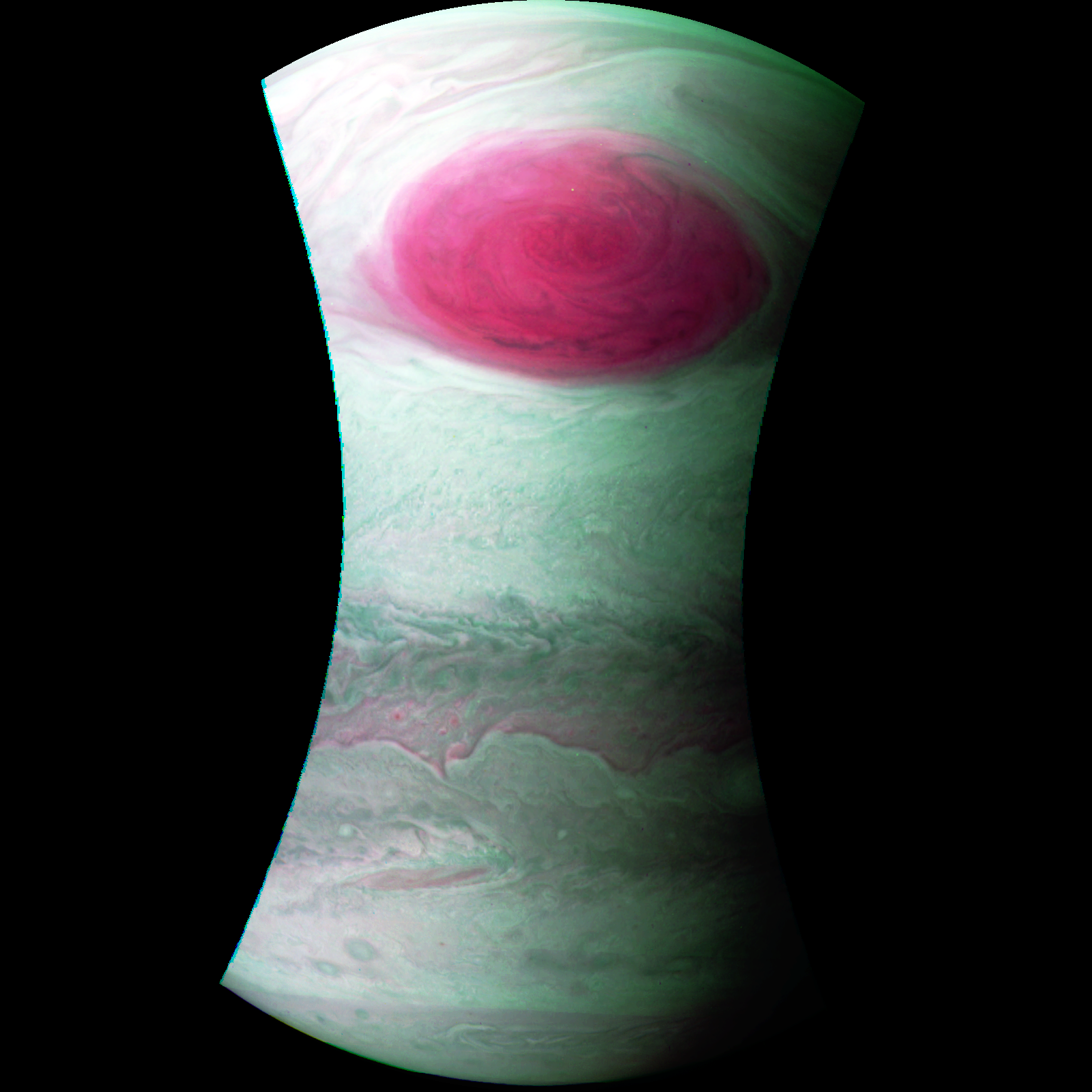 Junocam pixels are 12 bits deep from the camera but are converted to 8 bits inside the instrument using a lossless "companding" table, a process similar to gamma correction, to reduce their size. All Junocam products on the missionjuno website are in this 8-bit form as received on Earth. Scientific users interested in radiometric analysis should use the "RDR" data products archived with the Planetary Data System, which have been converted back to a linear 12-bit scale.