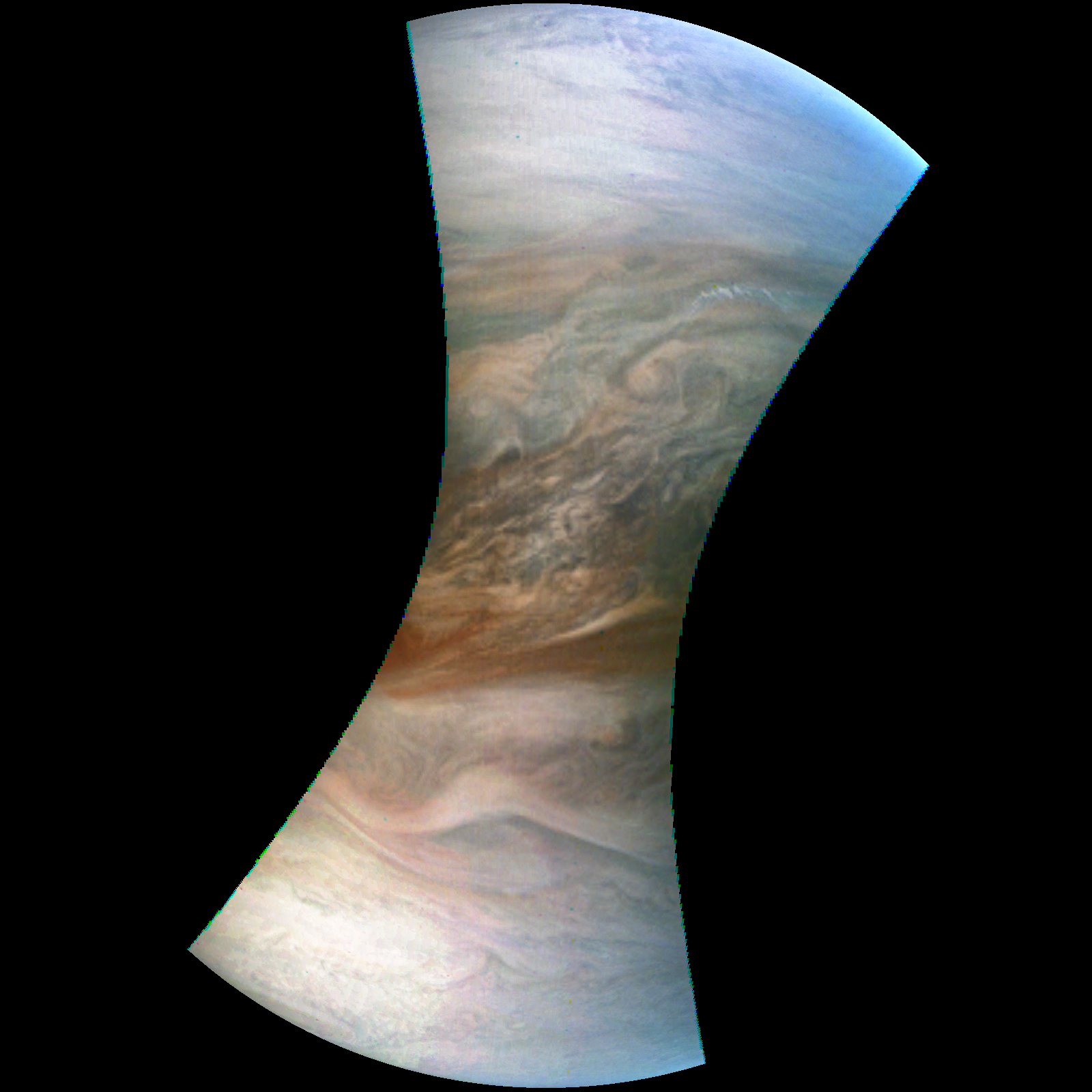 Junocam pixels are 12 bits deep from the camera but are converted to 8 bits inside the instrument using a lossless "companding" table, a process similar to gamma correction, to reduce their size. All Junocam products on the missionjuno website are in this 8-bit form as received on Earth. Scientific users interested in radiometric analysis should use the "RDR" data products archived with the Planetary Data System, which have been converted back to a linear 12-bit scale.