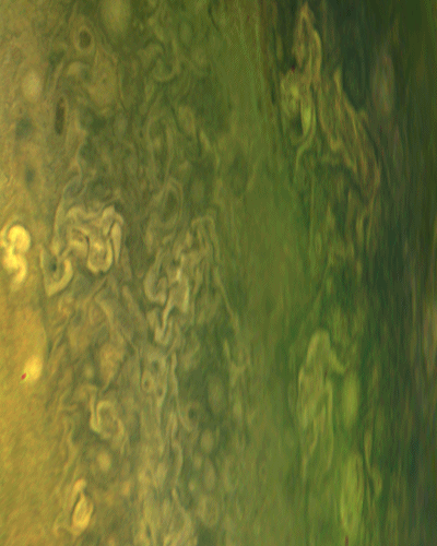 The animated gif is composed of two cropped cylindrical de-lamberted and enhanced maps of images #6159 and #6160, both processed directly from the raws. The images have been taken on 2016 Aug 27, before Juno's perijove 1. North is to the right. The time span between the two images has been about 72 minutes.