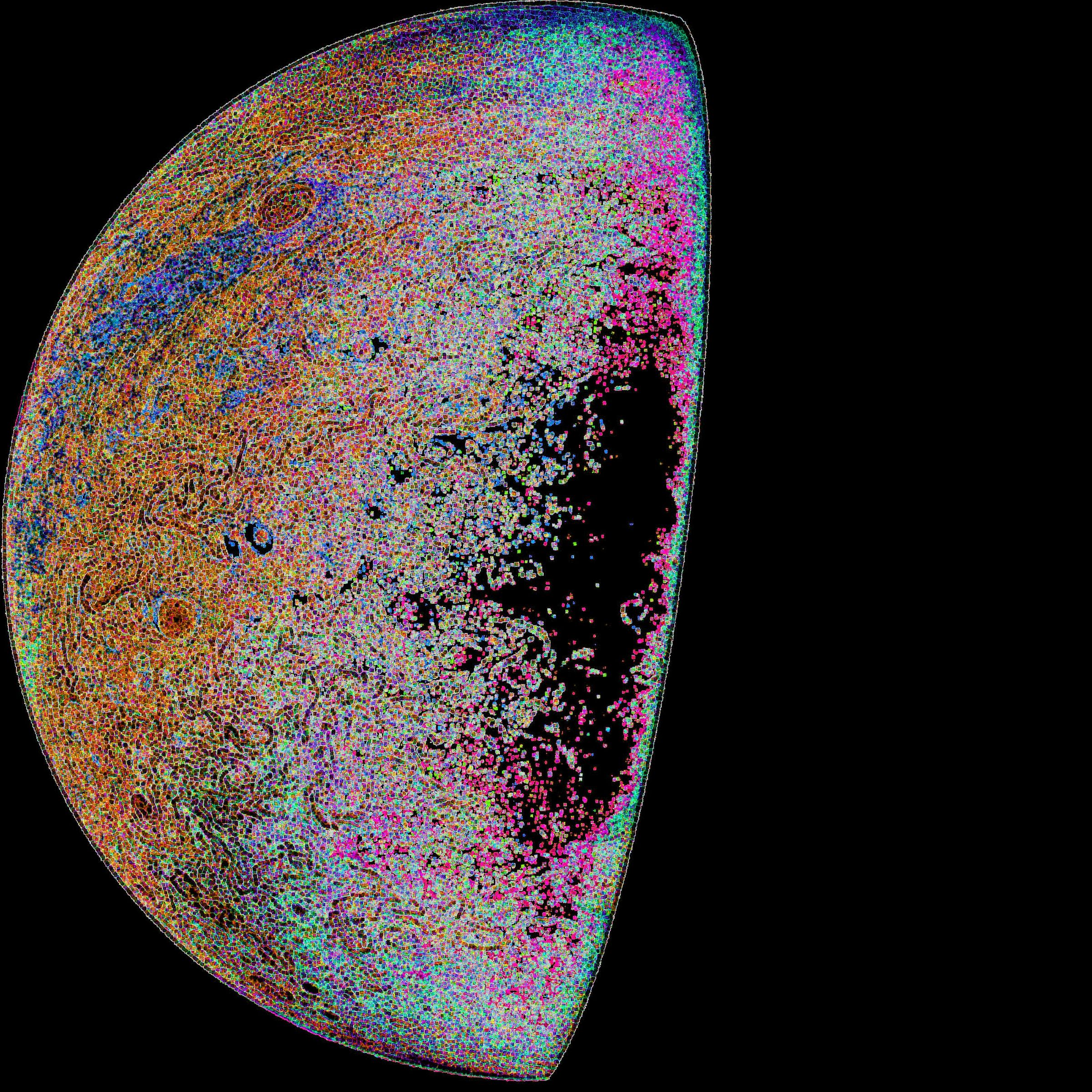 Junocam pixels are 12 bits deep from the camera but are converted to 8 bits inside the instrument using a lossless "companding" table, a process similar to gamma correction, to reduce their size. All Junocam products on the missionjuno website are in this 8-bit form as received on Earth. Scientific users interested in radiometric analysis should use the "RDR" data products archived with the Planetary Data System, which have been converted back to a linear 12-bit scale.