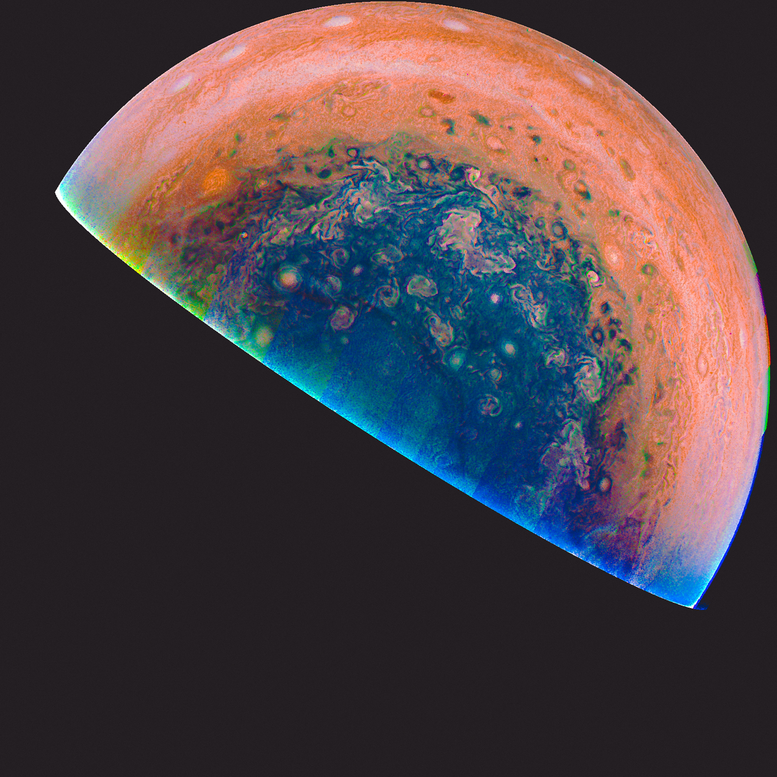 Junocam pixels are 12 bits deep from the camera but are converted to 8 bits inside the instrument using a lossless "companding" table, a process similar to gamma correction, to reduce their size. All Junocam products on the missionjuno website are in this 8-bit form as received on Earth. Scientific users interested in radiometric analysis should use the "RDR" data products archived with the Planetary Data System, which have been converted back to a linear 12-bit scale.