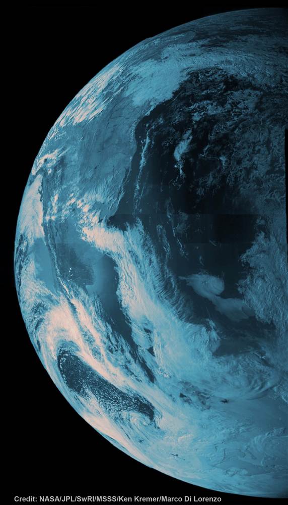 NASA's Juno probe captured the image data for this composite picture during its Earth flyby on Oct. 9. Separate images were combined by Ken Kremer and Marco Di Lorenzo, and false-color blue has been added to reflect a view provided by a near-infrared filter that is typically used to detect methane.
