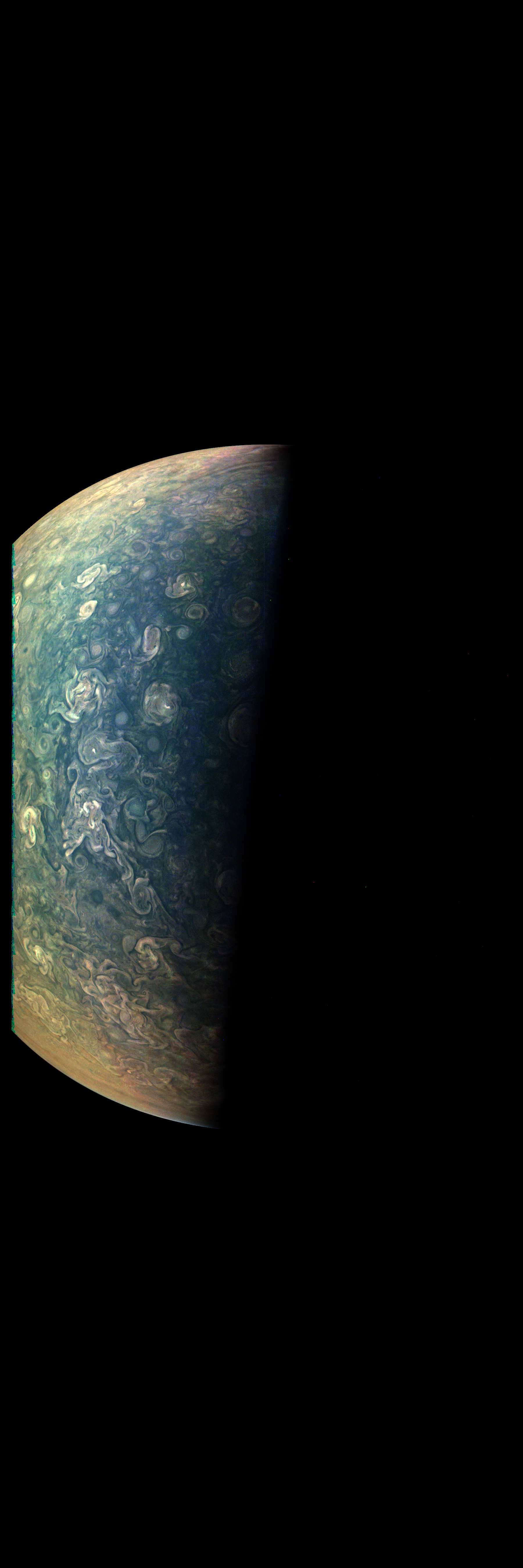 This image has been taken during Juno's Perijove-10 Jupiter flyby. It is rendered directly from the raw in one monolithitic step, except file format conversions.