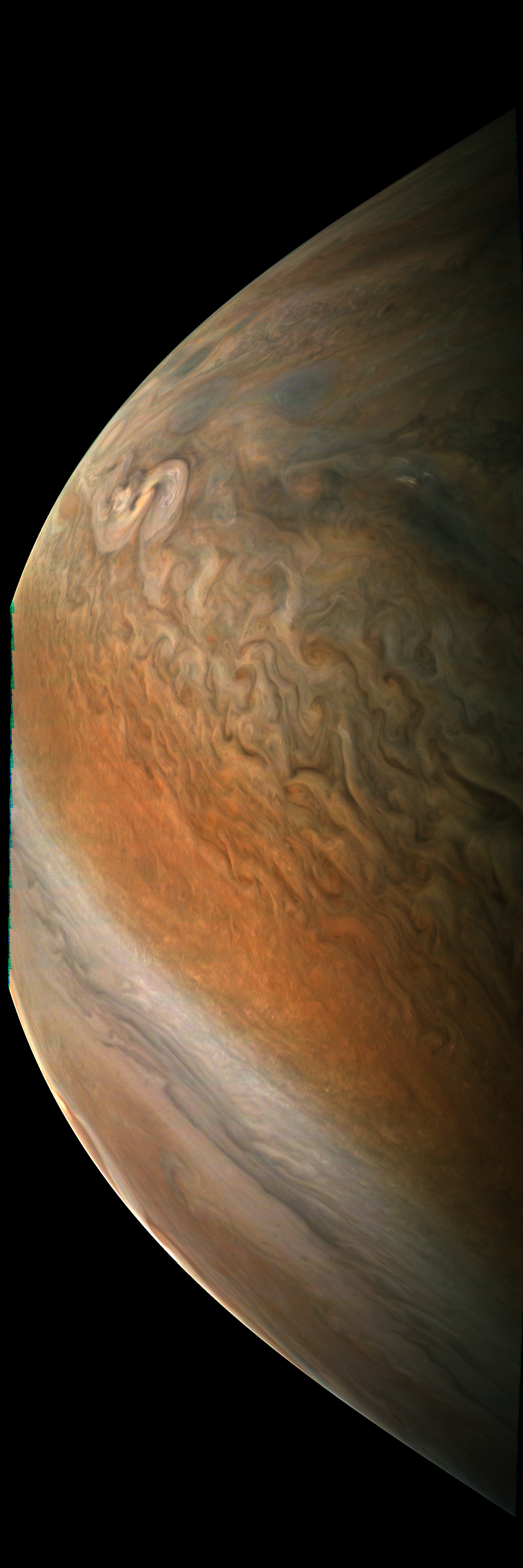 This image has been taken during Juno's Perijove-10 Jupiter flyby. It is rendered directly from the raw in one monolithitic step, except file format conversions.