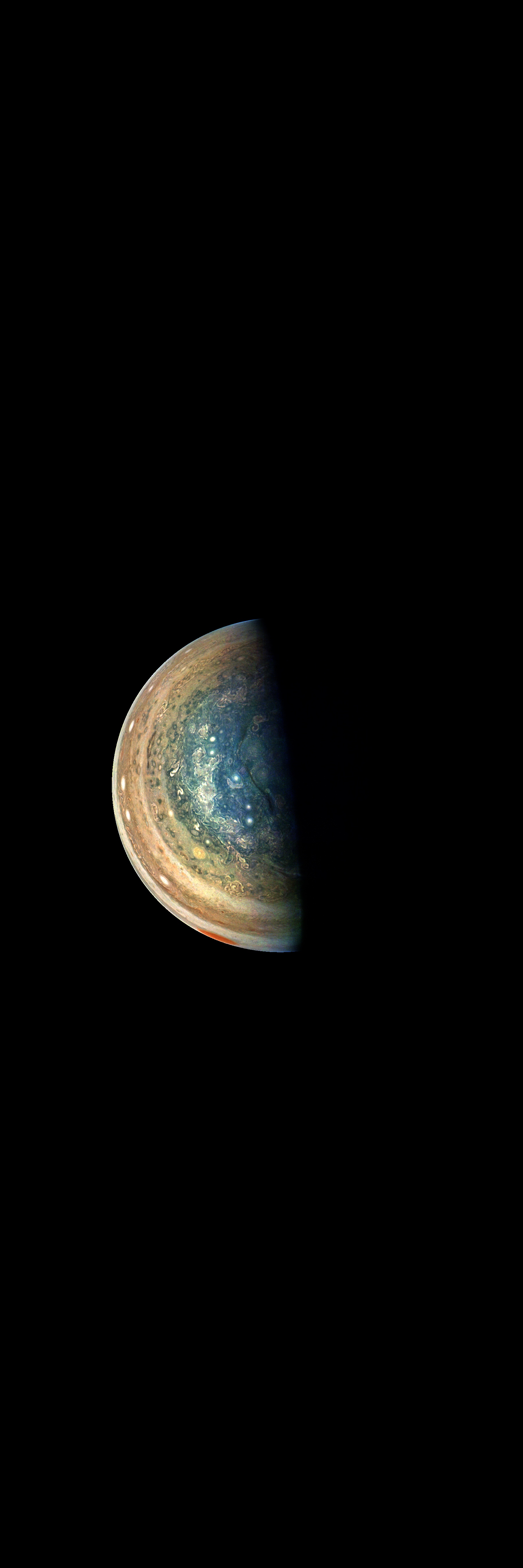 This image has been taken during Juno's Perijove-10 Jupiter flyby. It is rendered directly from the raw in one monolithitic step, except file format conversions.