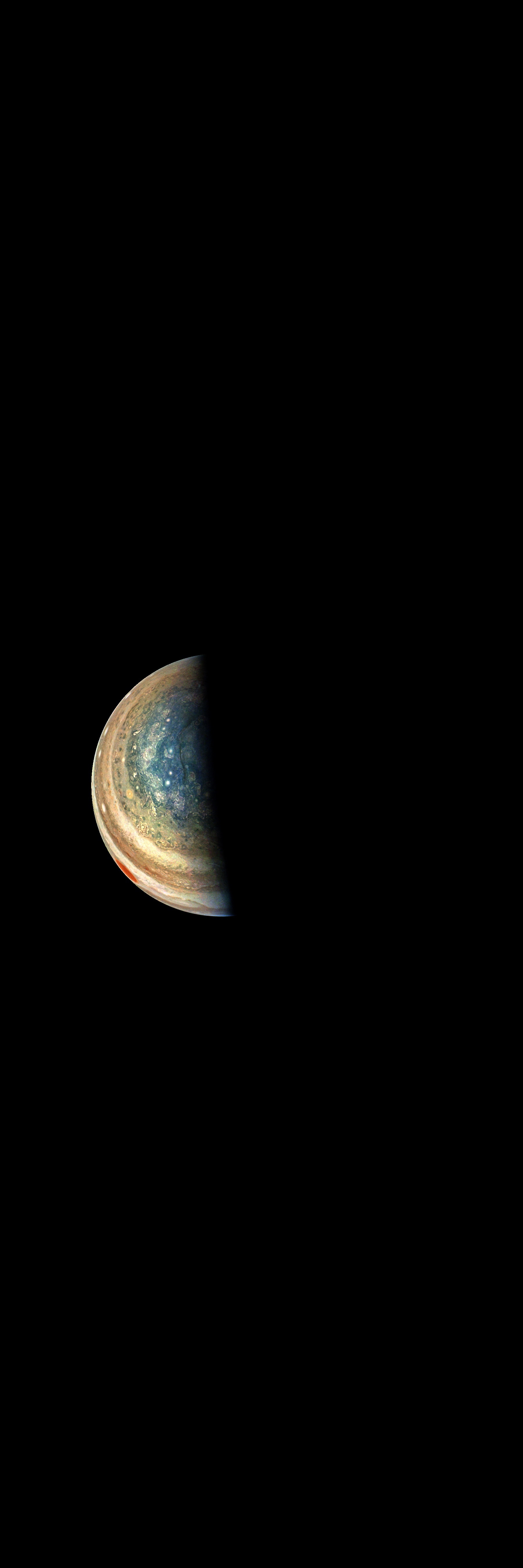 This image has been taken during Juno's Perijove-10 Jupiter flyby. It is rendered directly from the raw in one monolithitic step, except file format conversions.