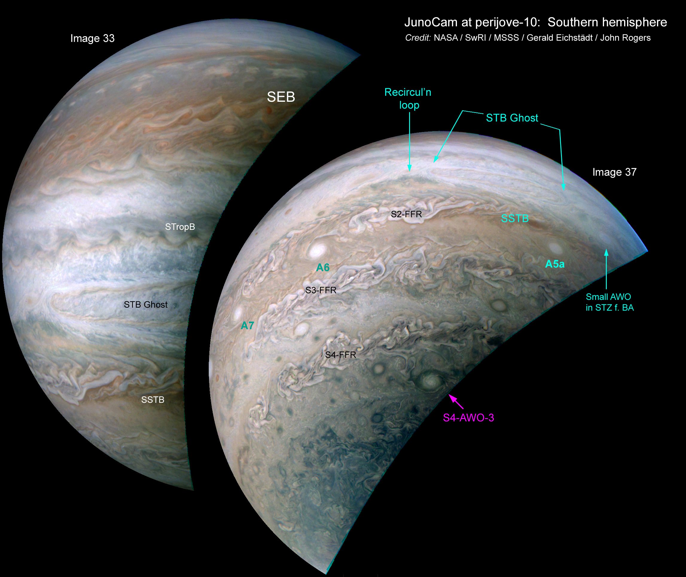 An expected highlight of PJ10 was the sequence of views of the cyclonic circulation called the STB Ghost, which was also covered at PJ8. The images also cover the dark grey-and-orange complex SW of it, which I call the recirculation loop (although it is not obvious from these images which ways the winds are blowing within it at present). This is part of a report on the PJ10 images just posted at: