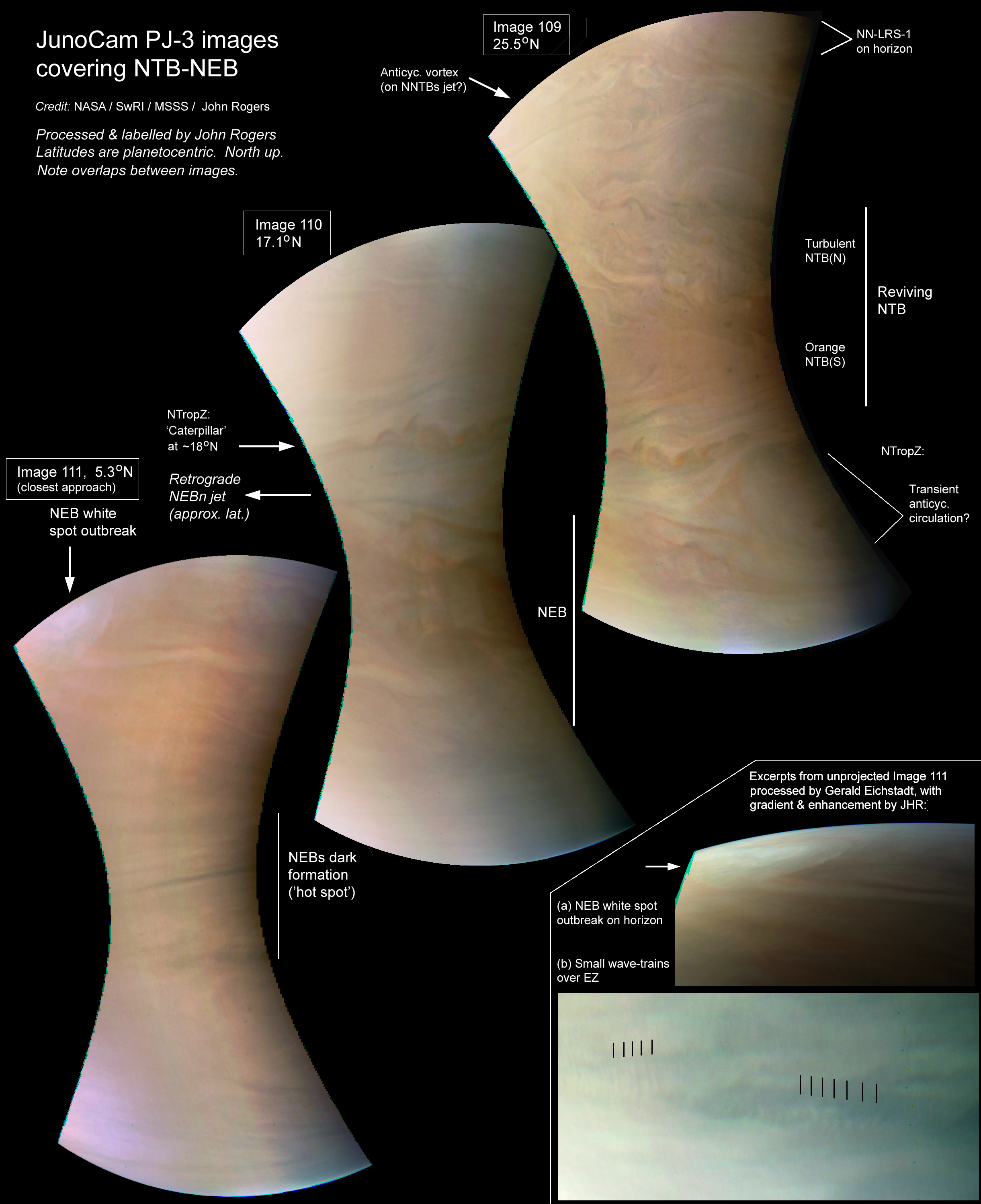 These 3 overlapping images show the intricate cloud textures and colours across the newly reviving NTB and the highly disturbed NEB. They capture a unique transient stage in the great NTB jet outbreak; the orange NTB(S) developed in recent weeks, plus turbulent streaks N and S of it. Two tiny dark spots within the orange belt are notable (one also visible in image 110).